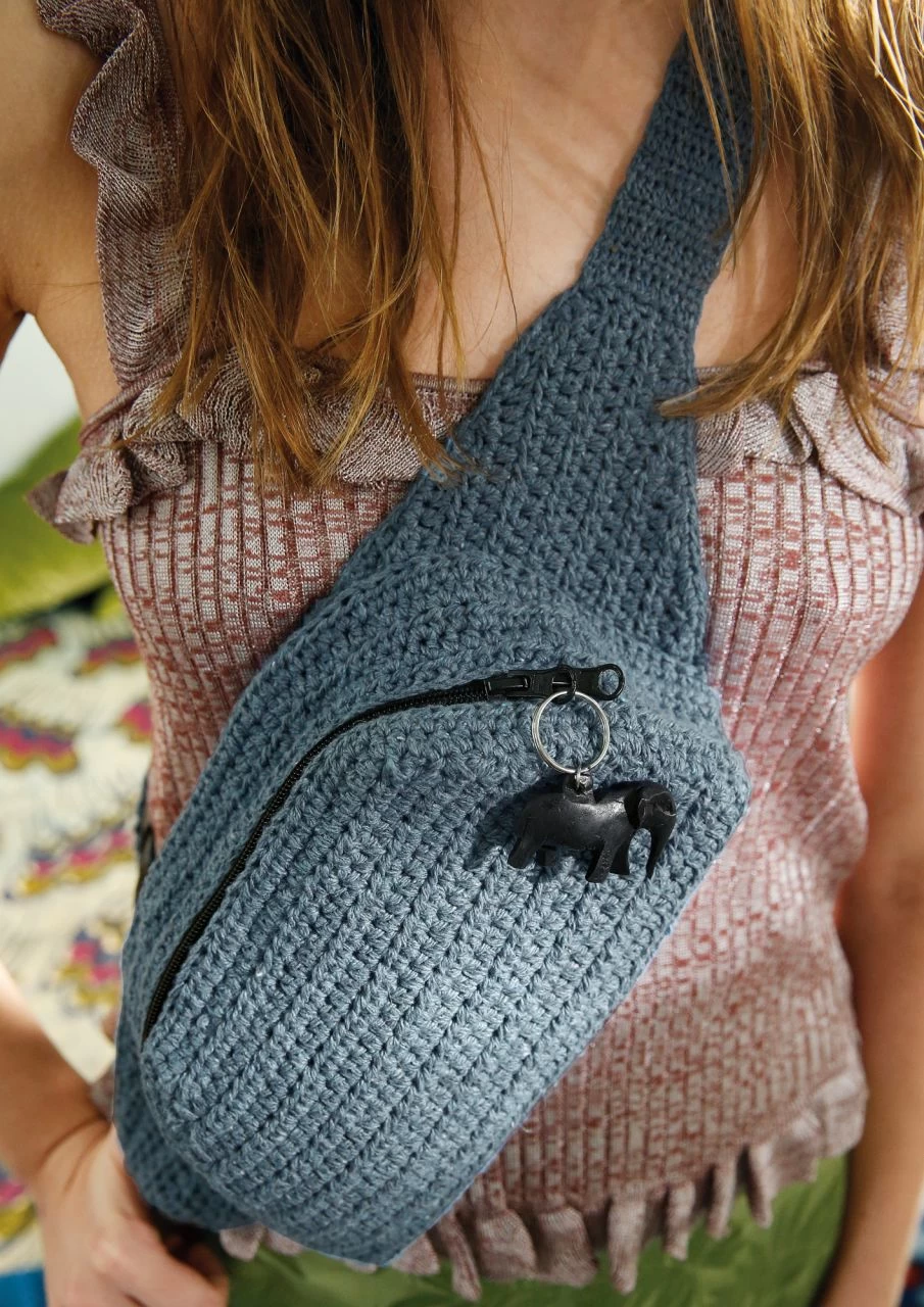 Über der Jacke, unter dem Mantel, um die Taille gegürtet, locker um die Hüften geschnallt oder (besonders hip) crossbody diagonal über eine Schulter – ganz egal, wie du deine Bauchtasche trägst, sie ist immer angesagt und auf jeden Fall super praktisch. Sehr zeitgemäß häkelst du die smarte Gürteltasche (auch Hip Bag genannt) aus der recycelten Baumwolle ggh REVA im Jeans-Look, Ein eingenähter Zwei-Wege-Zipper sorgt für hohe Funktionalität und setzt in Schwarz einen dekorativen Akzent. Ganz stilecht wird der Gurt mit einem Steckverschluss geschlossen.