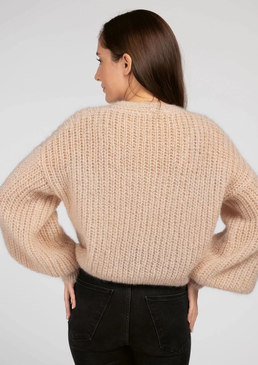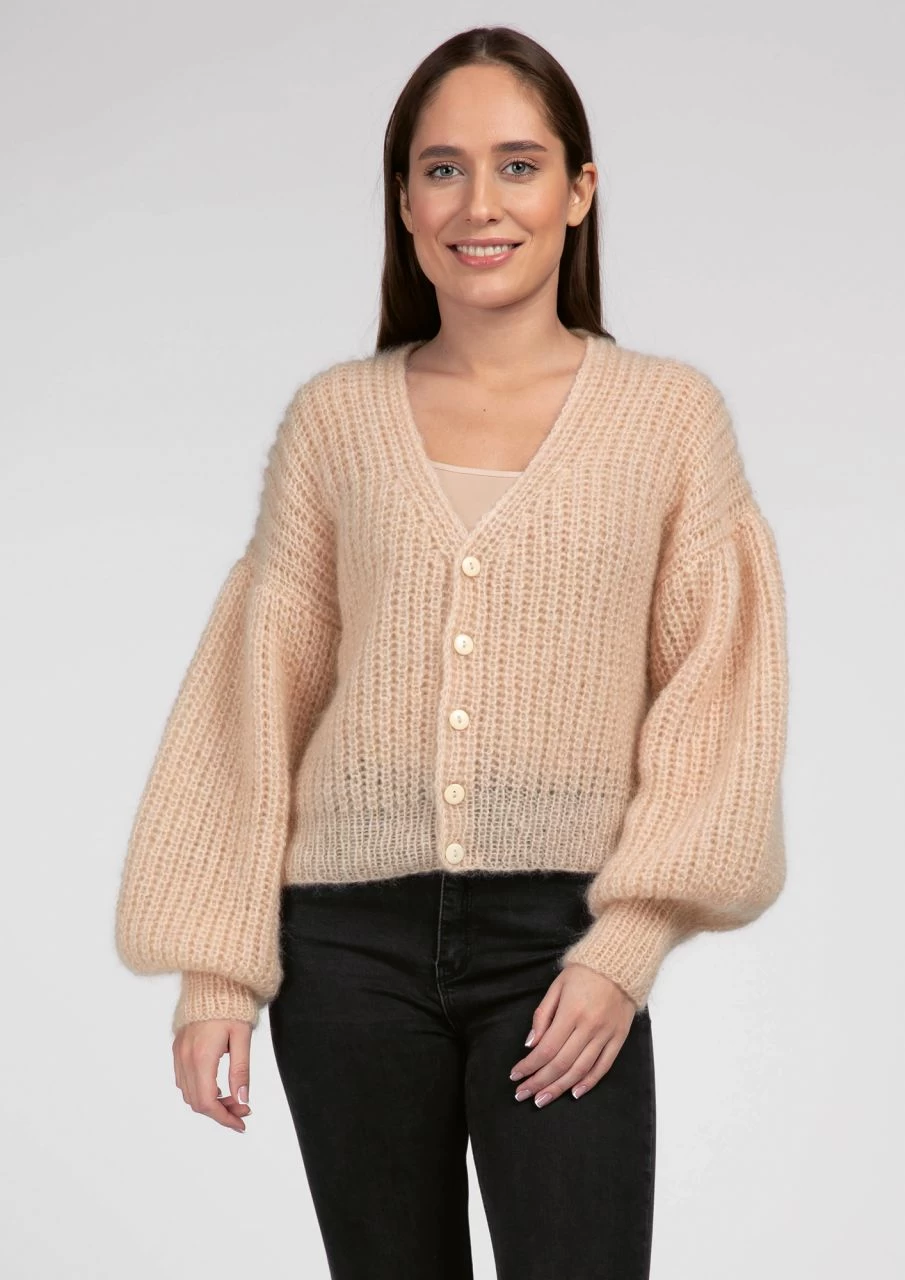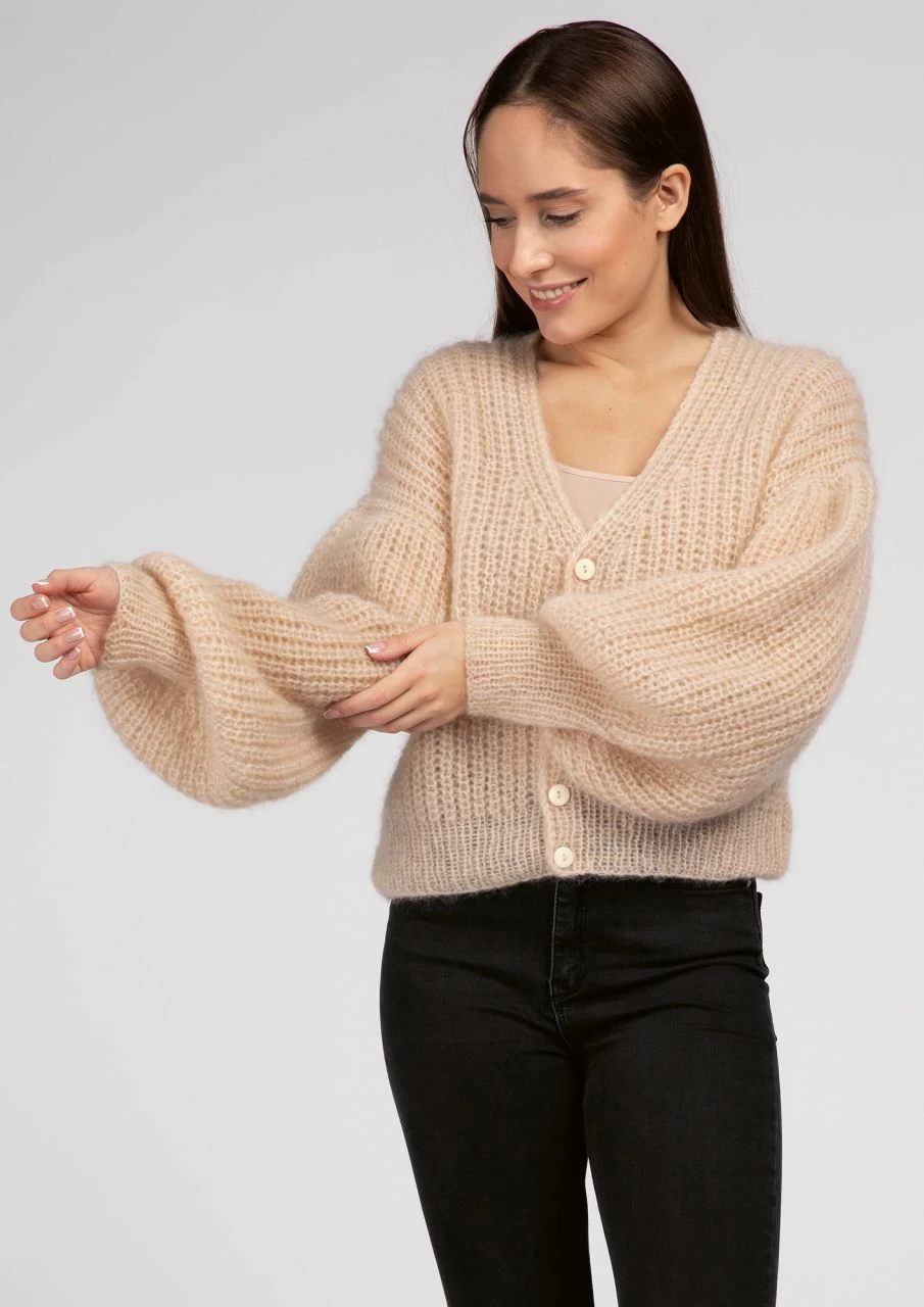 Cardigan, Wolljacke, Strickjacke, Mohairjacke, dreifädig gestrickte Halbpatent-Jacke, Cardigan mit Pluderärmeln, leichte Kurzjacke, Cardigan mit V-Ausschnitt, V-Ausschnitt-Jacke, geknöpfte Jacke in Kurzform, Jäckchen aus Mohair, kurzes, dreifädig gestricktes V-Ausschnitt-Jäckchen im Halbpatent