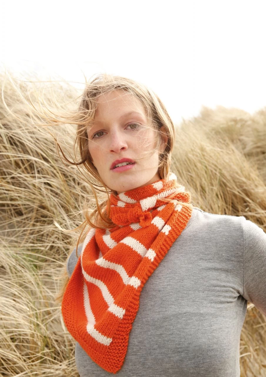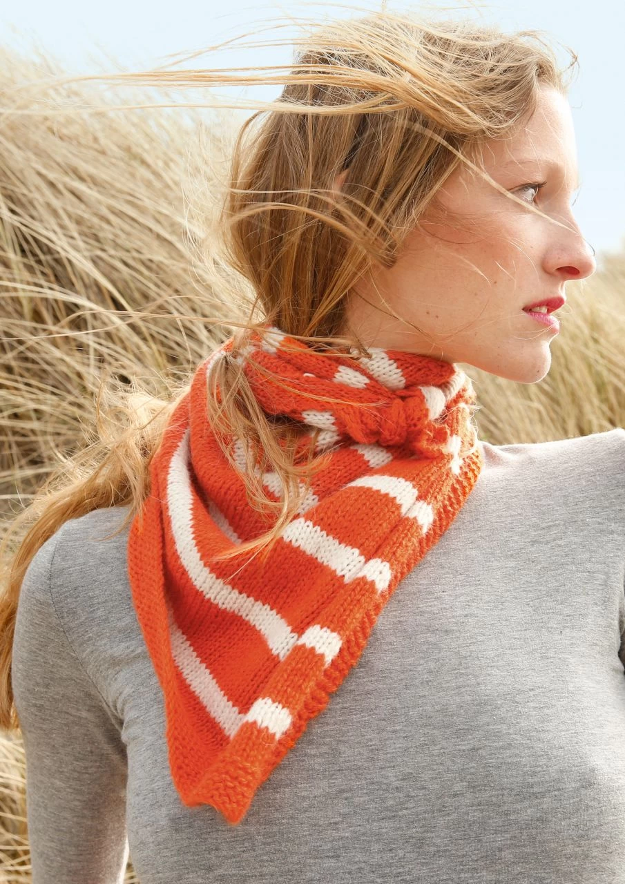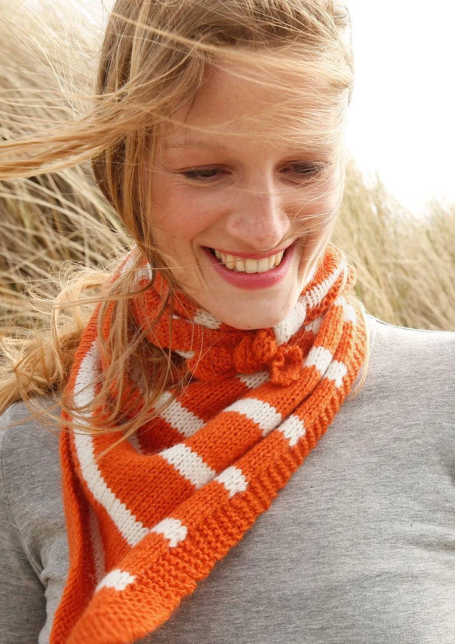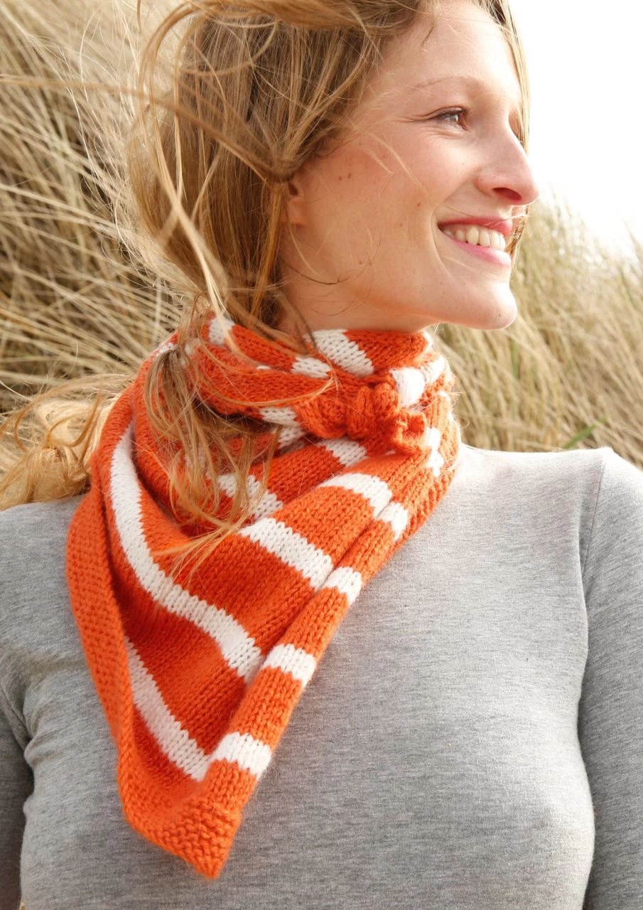 Orange als Grundfarbe, Weiß für die Streifen. Hierfür werden beim Dreieckstuch beidseitig des krausen Rands die Fäden der wollweißen Streifen auf der Rückseite der Arbeit verkreuzt.
