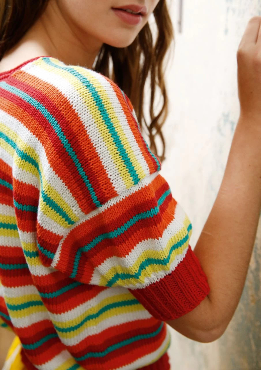 Ganz einfach zu stricken ist der lange Pullover in vier harmonische Farben. Mit U-Boot-Ausschnitt und gerade angesetzten 3/4-Ärmeln.