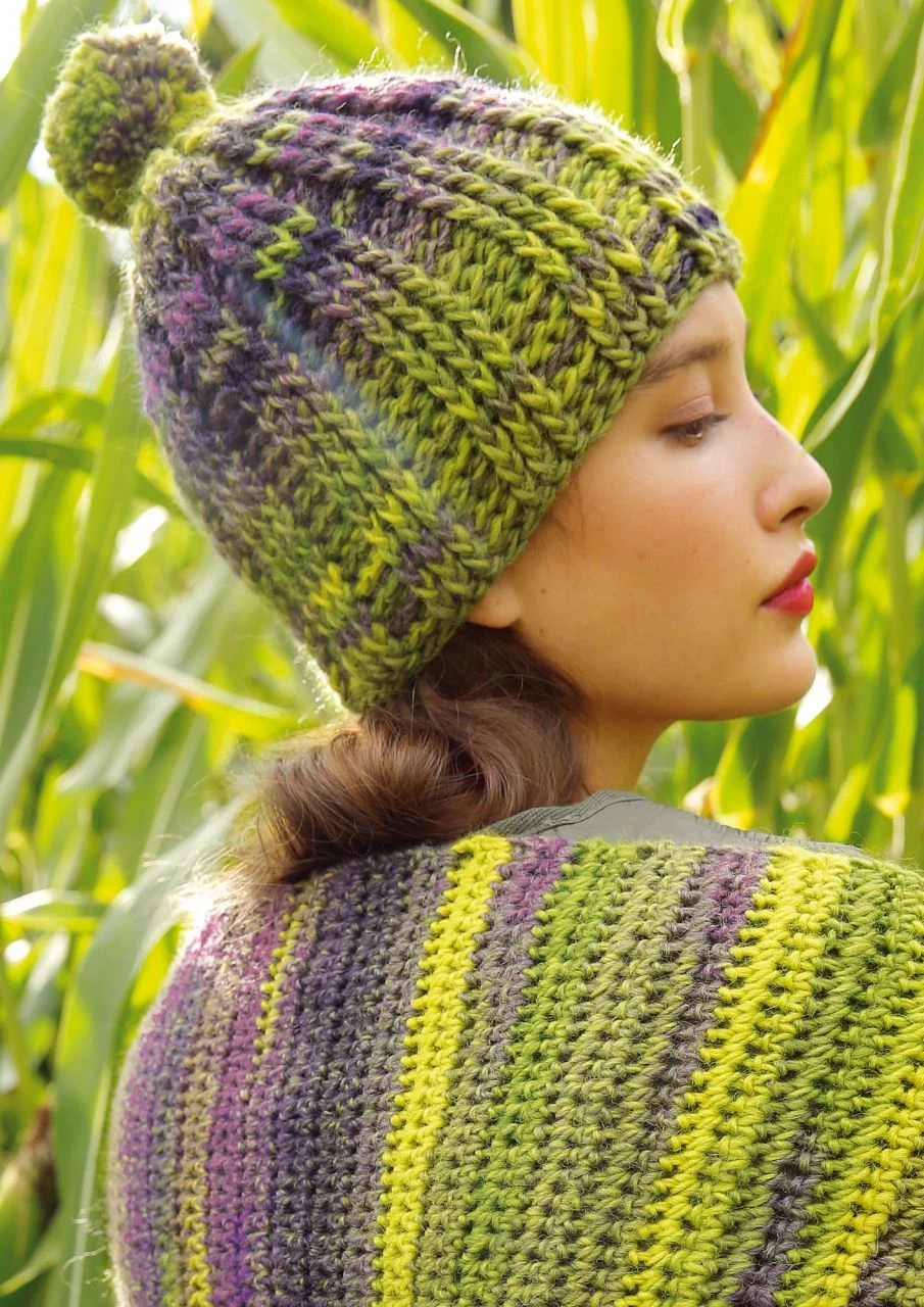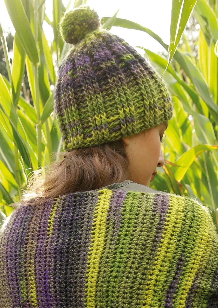 Die Mütze wird oben begonnen und in Reliefstäbchen genadelt – kein Hexenwerk, aber ein wenig Häkelerfahrung hilft. So entsteht ein plastisches, sehr dekoratives Rippenmuster, das der Mütze die schöne Struktur verleiht. Gekrönt wird sie von einem dicken Pompon, den du aus derselben ausdrucksstarken Schurwollemischung ggh Joker wickelst, aus der auch die Mütze gehäkelt wird. Sie zeigt abwechslungsreiche Melangen und einen wunderschönen Farbverlauf. Häkeln mit Farbverlaufsgarn ist toll, weil du gespannt beobachtest, wie sich nach und nach das Farbenspiel entfaltet. Da gibt es Reihe für Reihe was zu staunen. Häkel dir passend dazu die Häkelstola Comfy für ein winterwarmes Set.