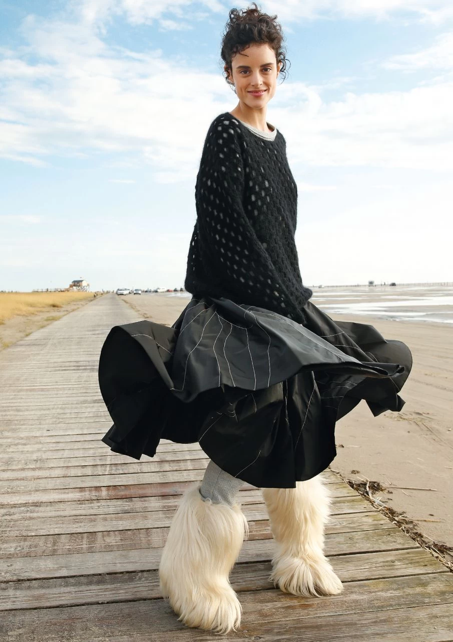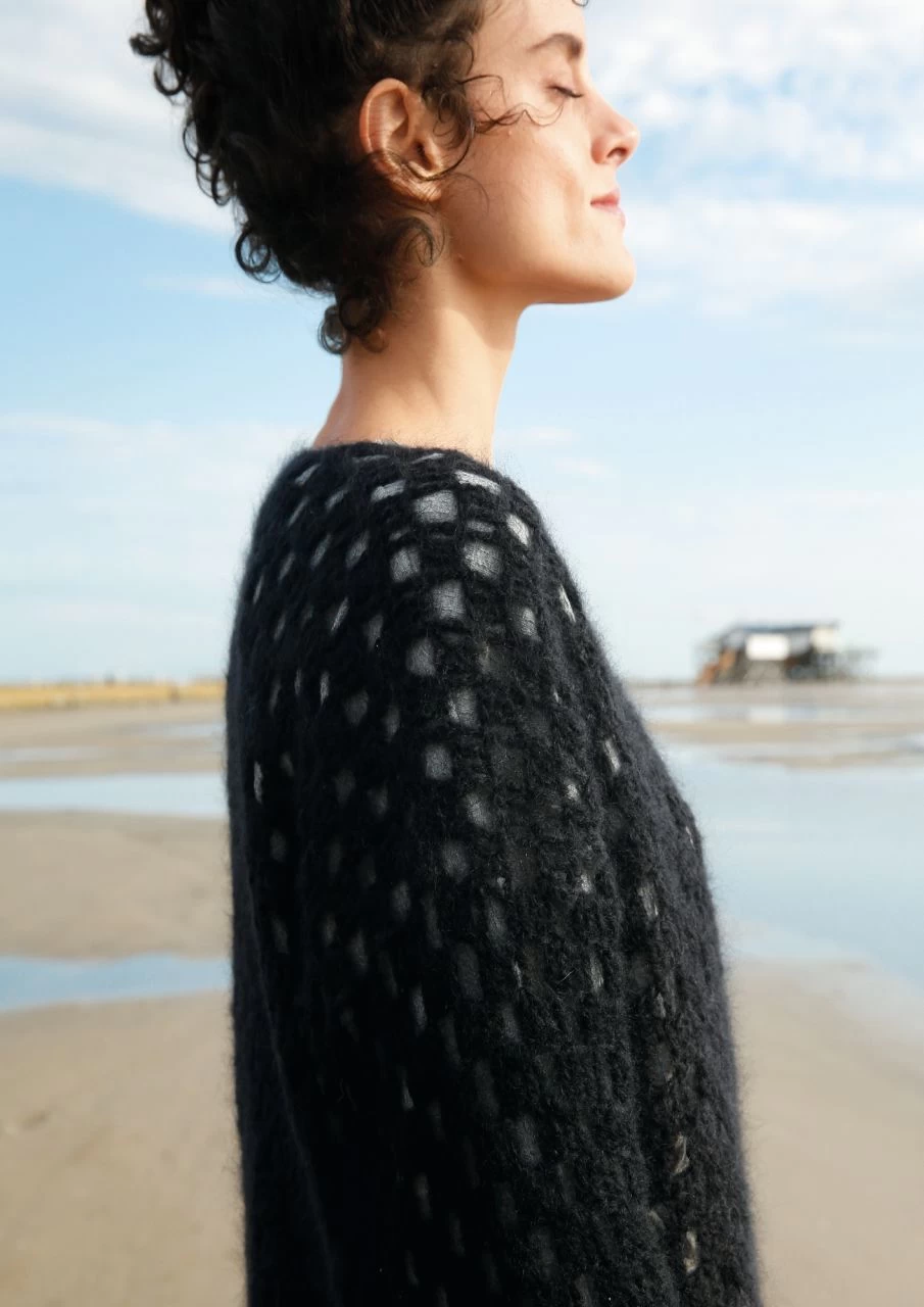Den lässigen Kuschelpulli häkelst du mit dreifachem Faden aus dem flauschig-zarten Mohairmischgarn ggh KID und zwar im Loch-Gittermuster mit Doppelstäbchen. Mit dieser simplen Doppelstrategie kommst du ziemlich schnell zu einem einfach tollen Pulli! Dabei wirkt das Gittermuster luftig und nicht zu kompakt, durch das flauschige Material wärmt der Pullover aber trotzdem angenehm. Das Häkelmuster geht dir nach ein paar Rapporten schnell und locker von der Hand, das bekommen auch AnfängerInnen an den Häkelnadeln problemlos hin. Die Ärmel werden von oben nach unten angehäkelt, so musst du nicht so viele Nähte schließen.