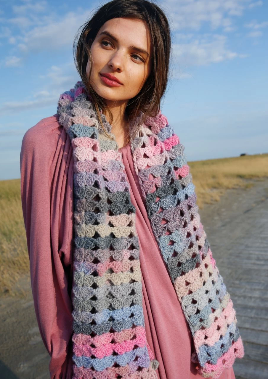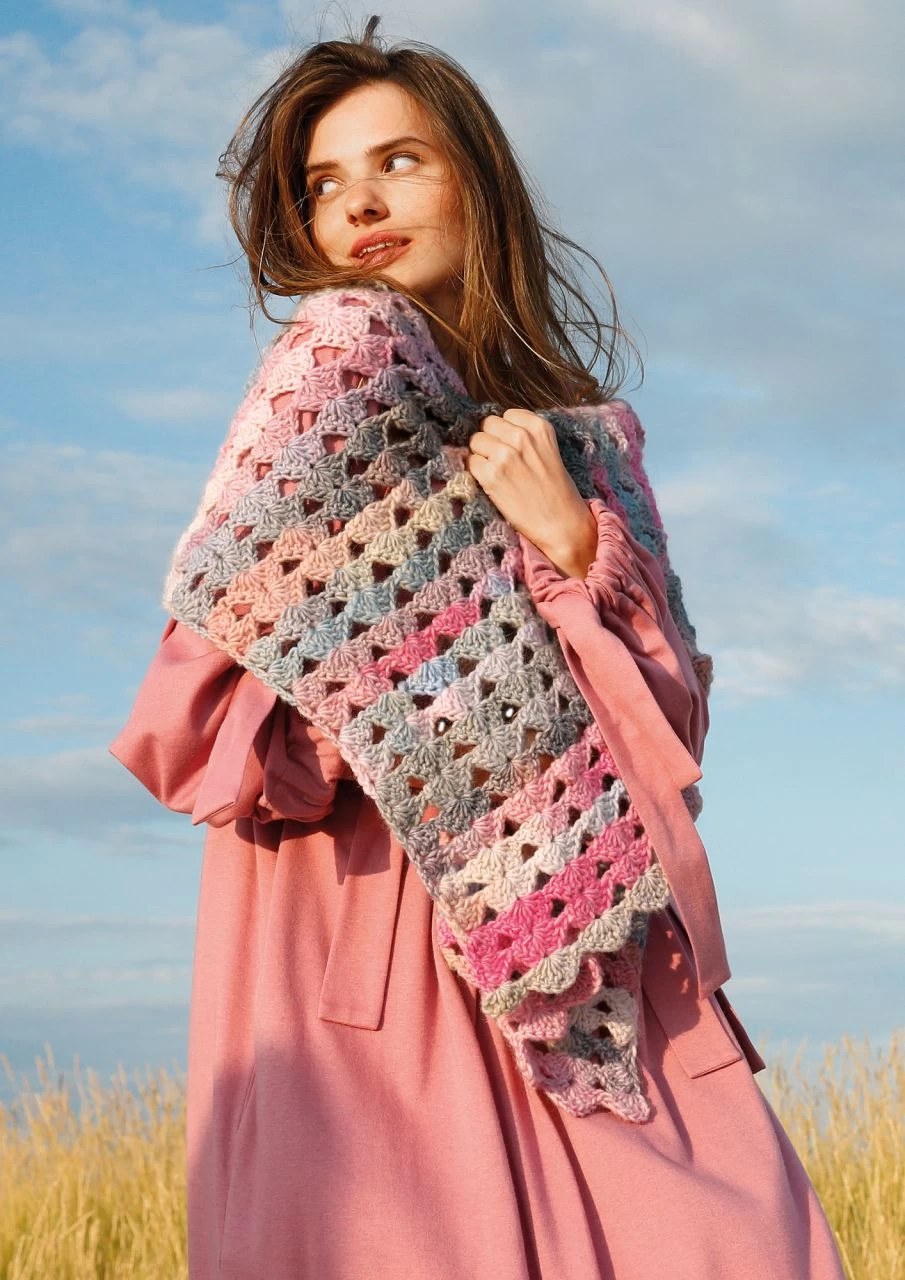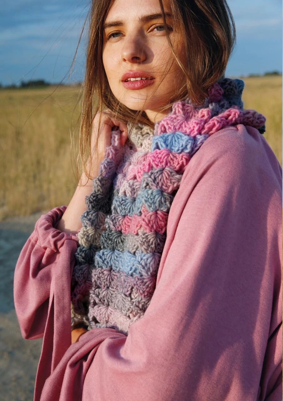 Drei Stäbchen, eine Luftmasche, drei Stäbchen – so formst du eine Muschel. Fortlaufend an- und übereinandergesetzt häkelst du diesen wunderbar weichen Schal aus der ausdrucksstarken Schurwollemischung ggh JOKER. Das Colorgarn macht das Häkeln zur Farbsafari: Welcher Ton kommt jetzt, welche Nuance zeigt sich als nächstes? So entstehen nach und nach abwechslungsreiche Melangen und ein wunderschöner Farbverlauf im Häkelmuster Da gibt es Reihe für Reihe was zu staunen und dein fertiger Schal zeigt ein vielfältiges Farbenspiel. Dazu ist die Wolle angenehm weich und das Muschelmuster verleiht dem Schal eine hübsche Struktur: Muscheln zum Kuscheln, also!