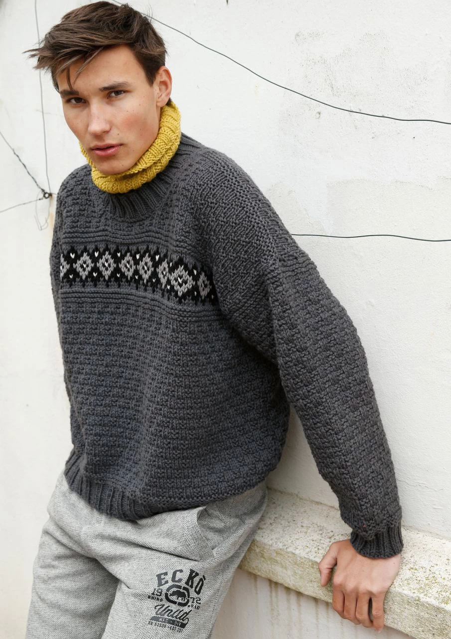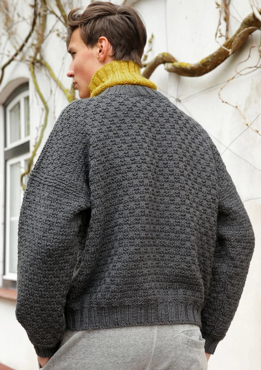 Ein Klassiker ist der flanellgraue Herrenpullover mit plastischem Strukturmuster. Blickfang beim Vorderteil ist die von krausen Rippen eingerahmte Jacquardbordüre. Der kontrastfarbene Rollkragen ist extra gestrickt und kann nach Wunsch angenäht werden.