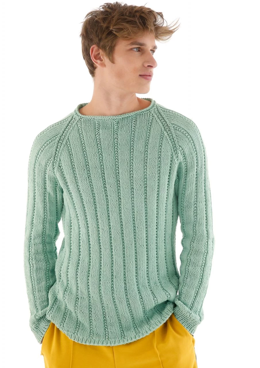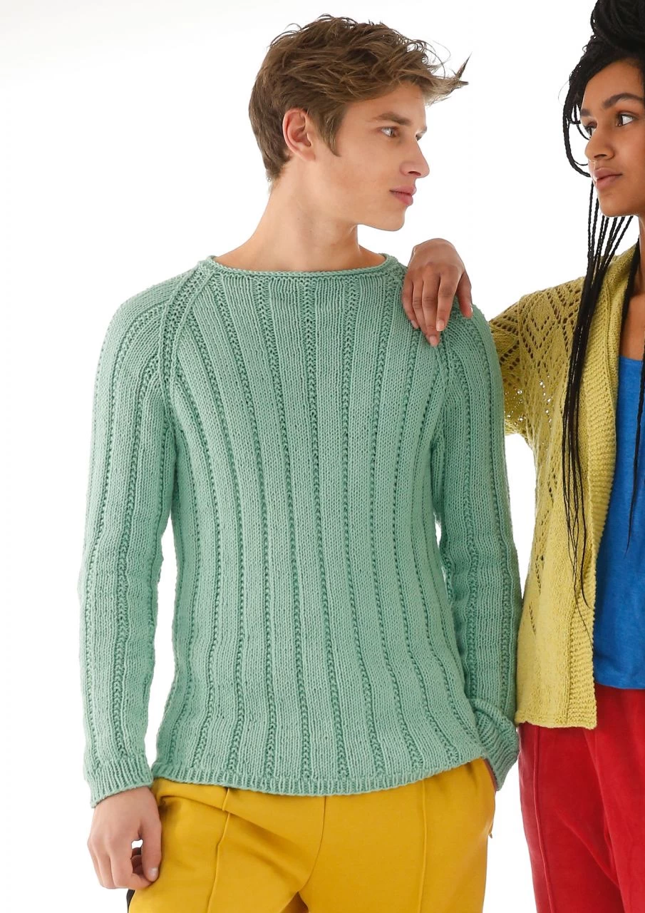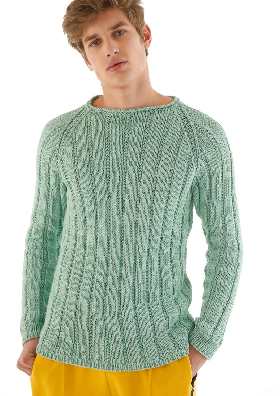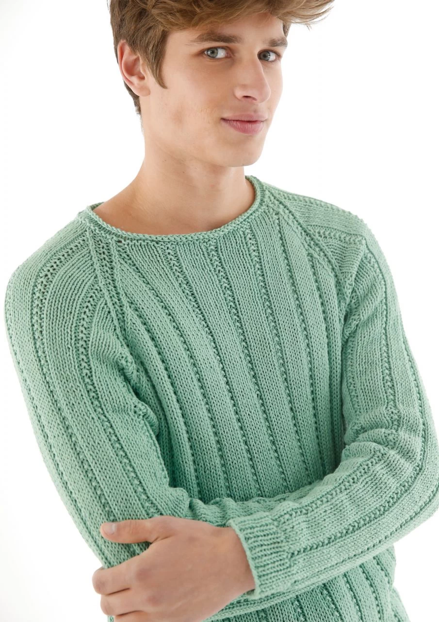 Aus reiner Baumwolle ist der Herrenpullover. Die Raglanpasse wird nahtlos in Runden gestrickt.