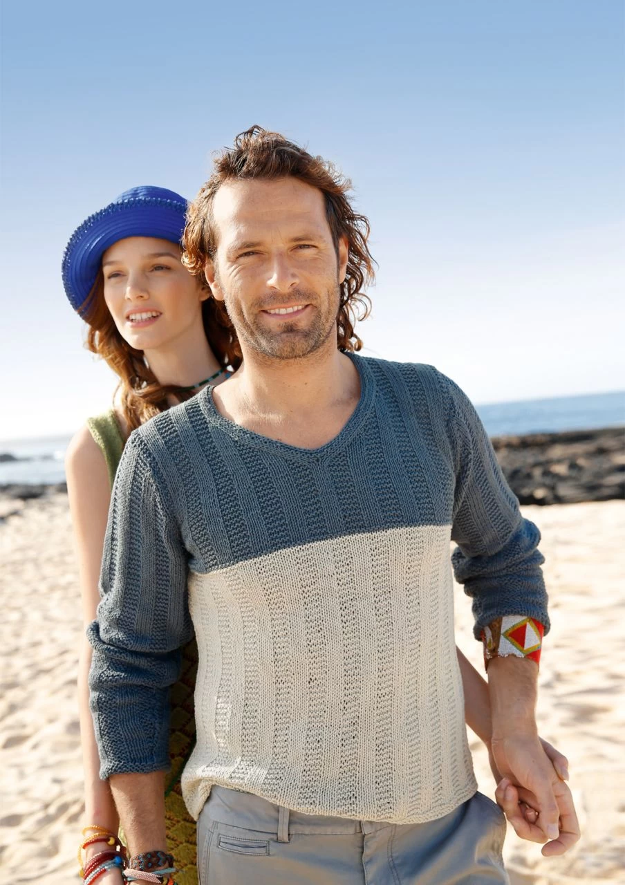 Maleknitting! Ein tolles Rebecca-Modell für den Mann, leger, modisch und maritim! Der Pullover wird 2-farbig gearbeitet. Der obere Bereich und die Ärmel sind in Schiefer und der übrige Pullover in der Farbe Kitt gearbeitet. Den Pullover ziert ein tolles Rippenmuster aus glatt rechten und kraus rechten Maschen. Der Herrenpullover hat einen V-Ausschnitt. Durch den Baumwoll-Leinen-Mix ist der Pullover auch an warmen Tagen angenehm zu tragen! Ein tolles Rebecca-Strickmodell, das sich auch für StrickanfängerInnen eignet!