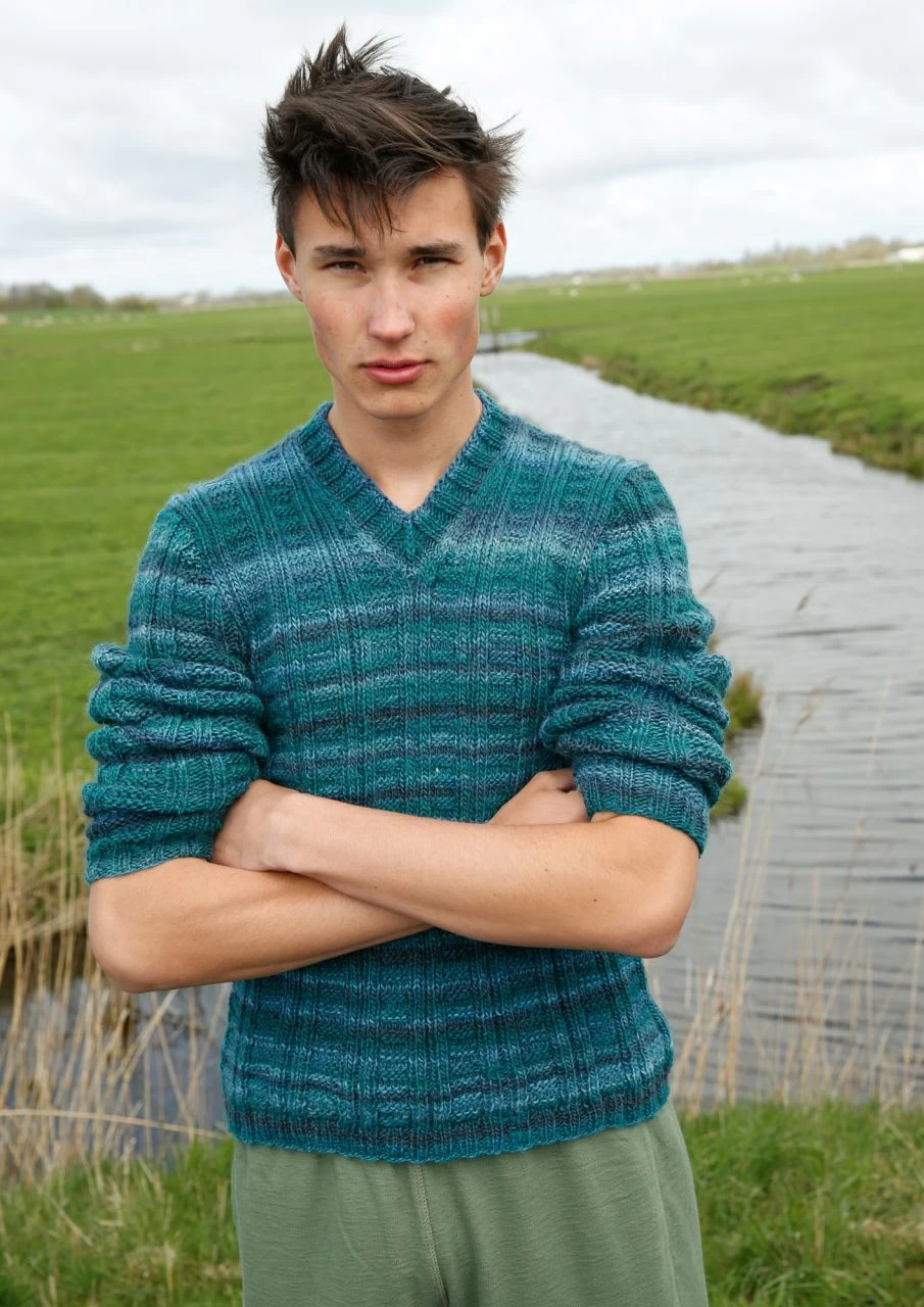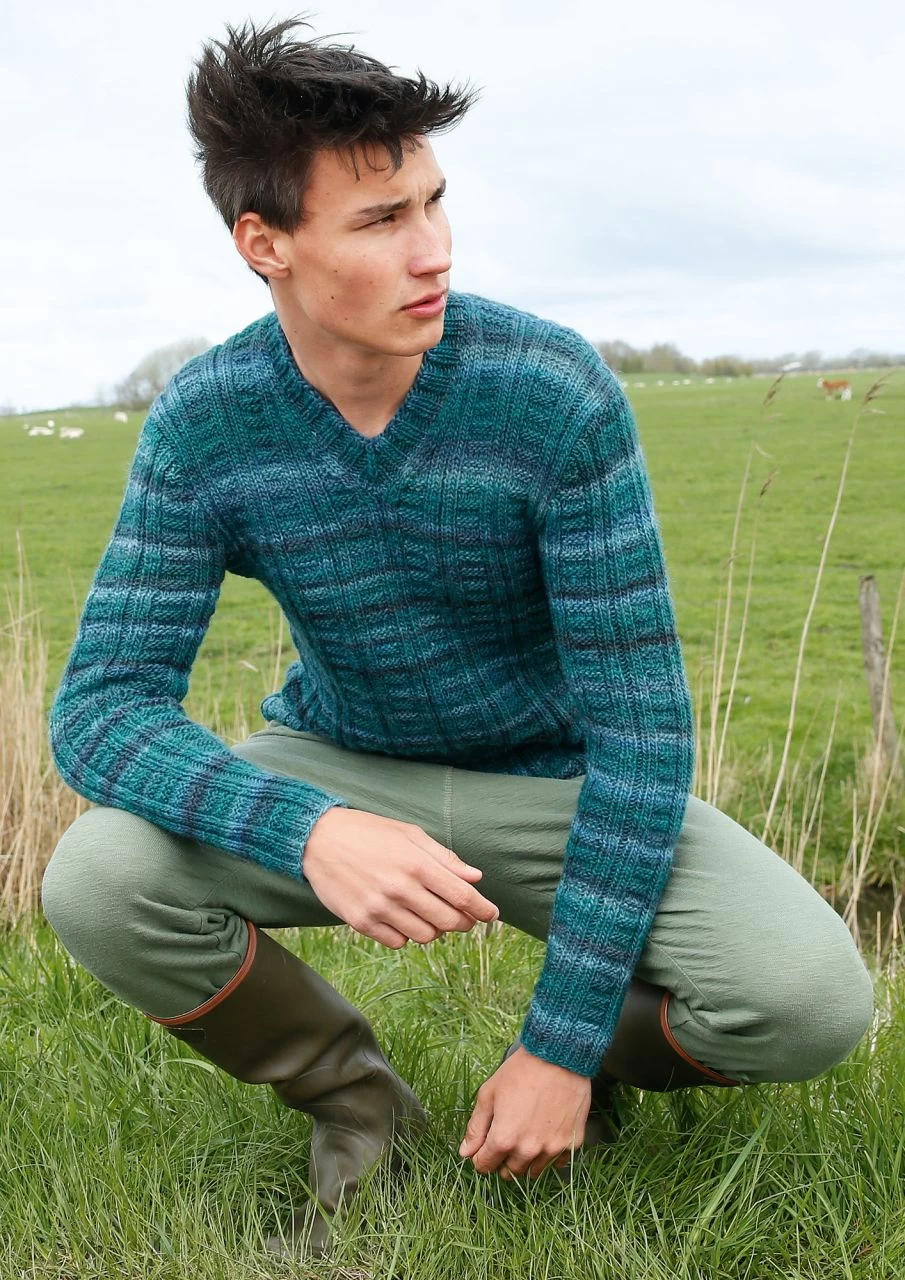 Sein Pullover mit V-Ausschnitt hat ein plastisches Strukturmuster mit Längsrippen. Das feine Garn aus Wolle und Alpaka ist erhältlich in elf harmonischen Farbkombinationen.