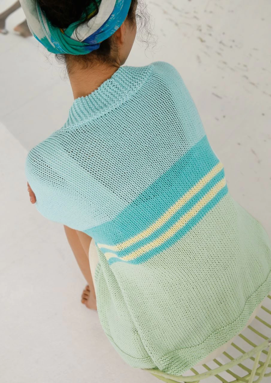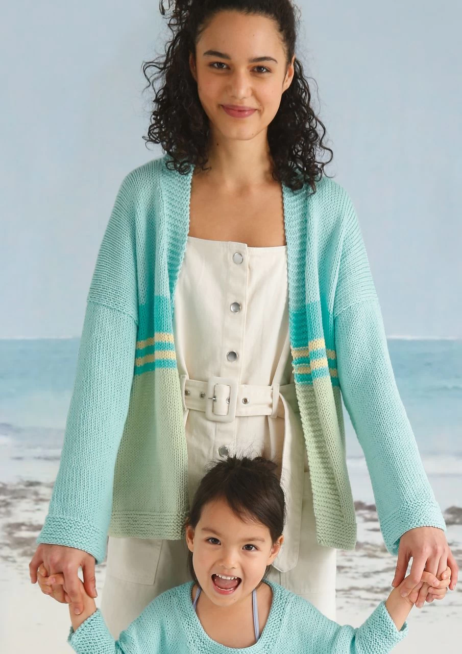Die leger geschnittene, verschlusslose Jacke in Mint, Aquamarin und Vanille zeigt ein angesagtes Streifendesign. Die Farbkombination wirkt sommerlich frisch und liegt voll im Trend. Du strickst nur glatt und kraus rechts – so ist die Jacke schnell fertig und gelingt dir auch, wenn du noch nicht so viel Strickerfahrung hast. Passend zur Jacke gibt es im Mini-Me-Style den niedlichen Kinderponcho Luanina.