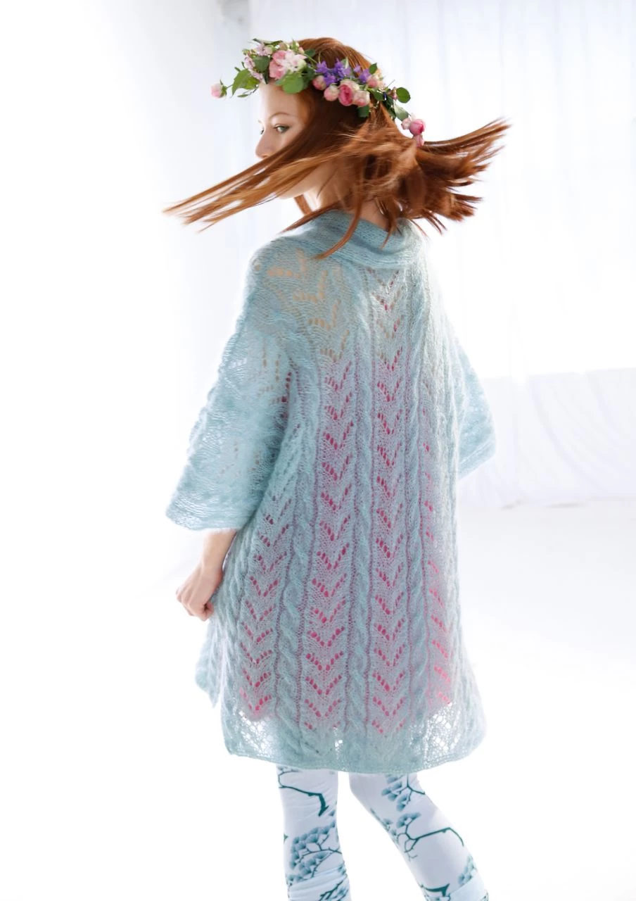 Jacken können auch romantisch! Das beweist dir dieses wunderschöne Modell mit filigranem Ajourmuster und locker geschlungenen Zöpfen aus hauchzarter ggh KID. Die halblangen, angeschnittenen Ärmeln strickt du in einem Stück mit Rücken und Seitenteilen mit, ebenso wie den hübschen Schalkragen. Das duftige, zweifädig verstrickte Mohairmischgarn in Kombination mit dem feinen Lochmuster gibt dem Mantel eine mädchenhafte Ausstrahlung. Die kannst du mit deinem Styling unterstreichen und z. B. ein Kleid dazu kombinieren, du kannst aber auch Kontraste einbauen und einem T-Shirt-Jeans-Outfit mit der Longjacke einen spannenden Twist geben. In jedem Fall liegt das Garn weich, leicht und luftig auf deiner Haut und trägt sich auch bei höheren Temperaturen sehr angenehm.