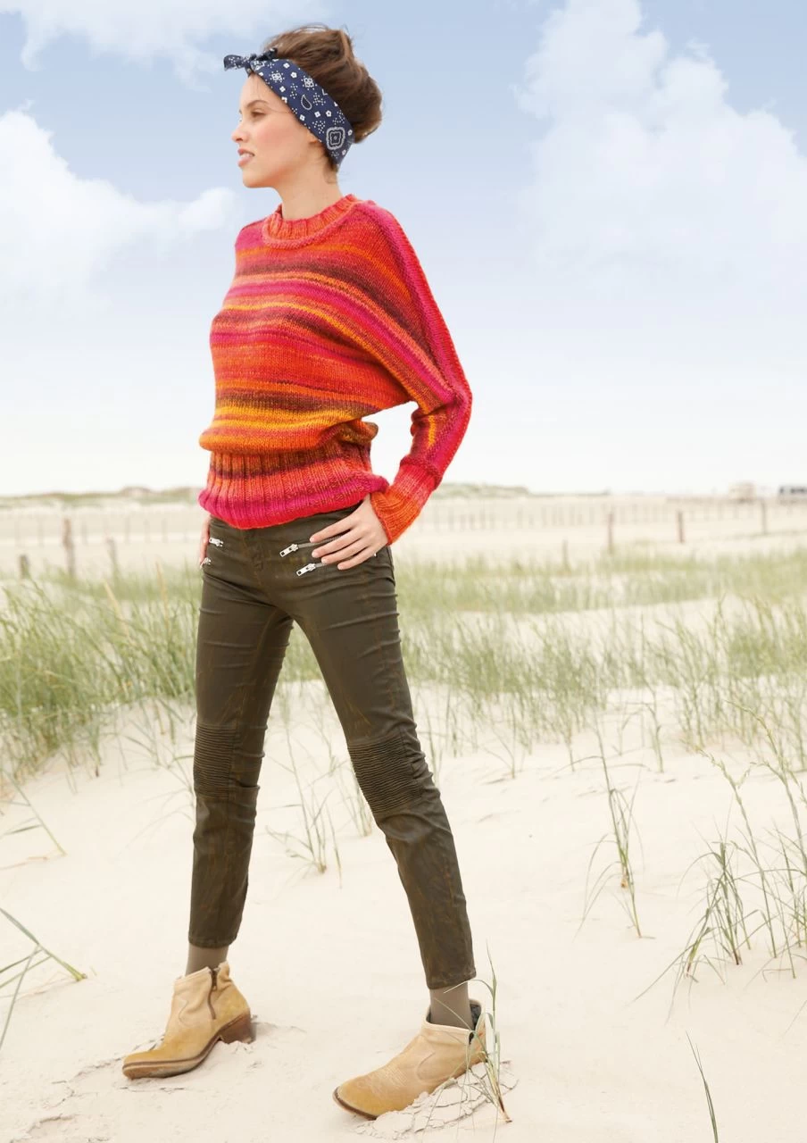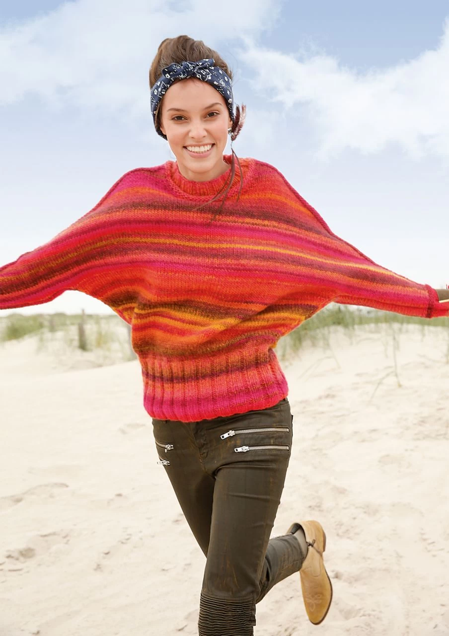 Der Orange-Pink melierte Fledermaus-Pullover wird mit dem ggh-Garn JOKER (53% Schurwolle / 47% Polyacryl) gestrickt.