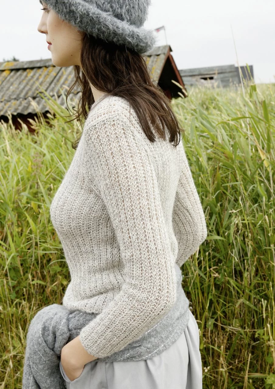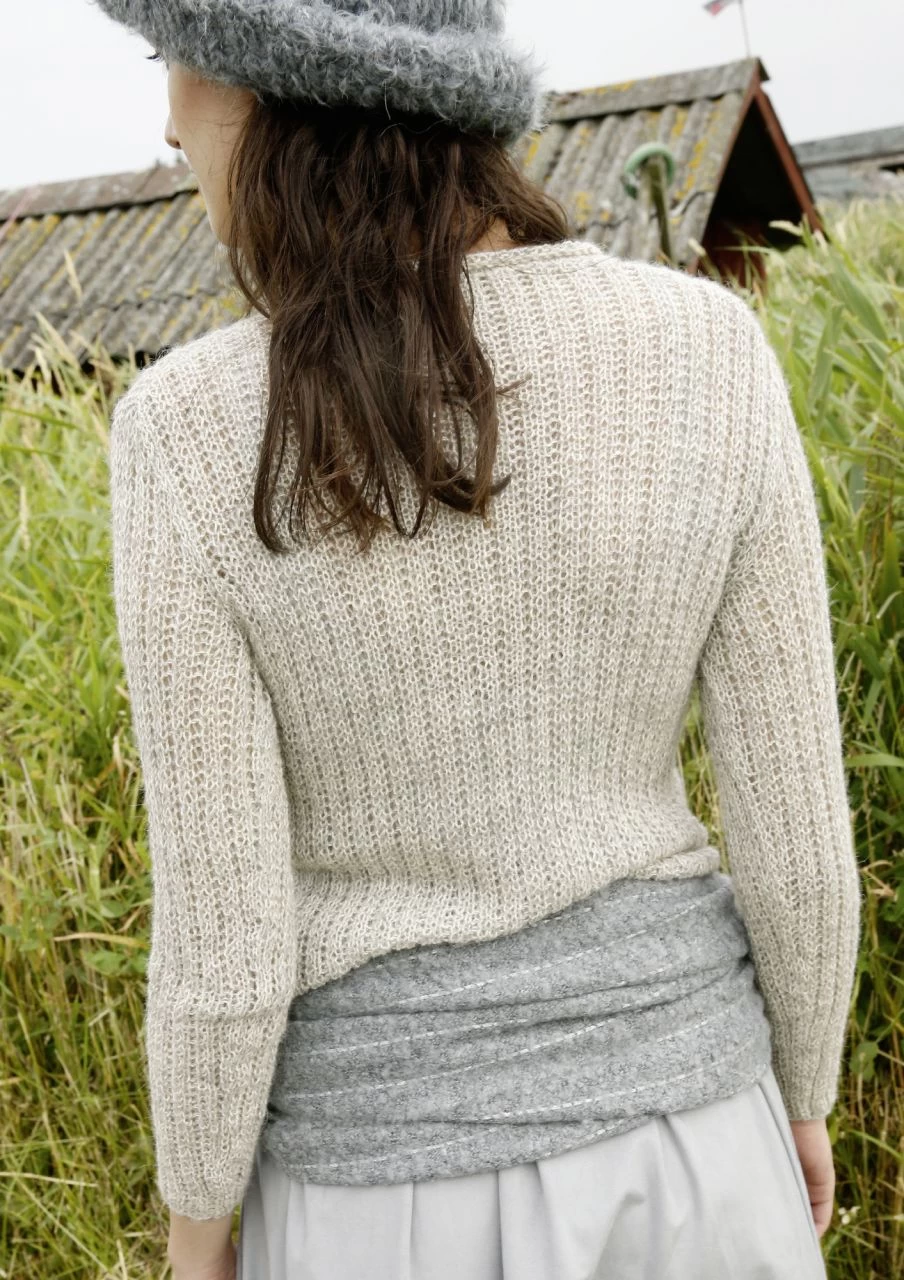 Mit zwei Fäden, je einem Faden Wollweiß und Hellgrau, im Rippenmuster gestrickt ist der melierte Pullover.