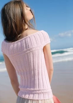 Gestrickt wird das melierte Top im Rippenmuster mit dem ggh-Garn CALYPSO (100% Baumwolle). Die Strickanleitung ist in der Rebecca-Ausgabe 66, Modell 5 erschienen.