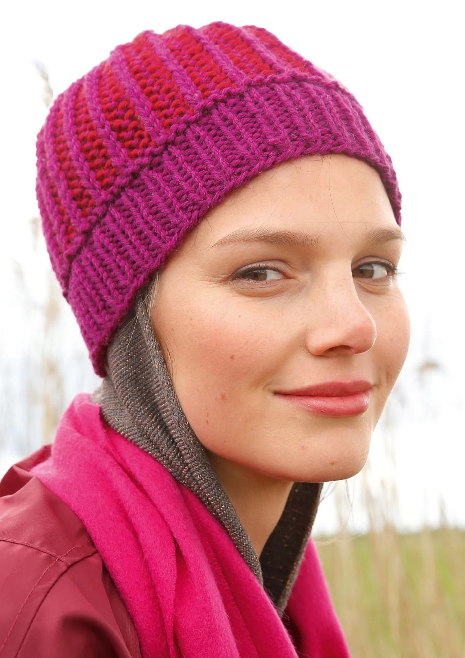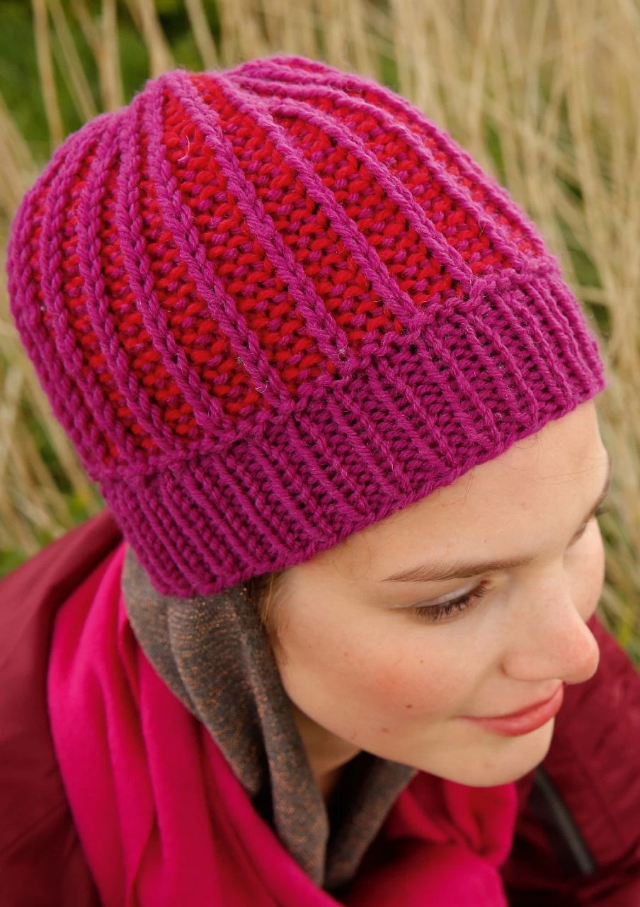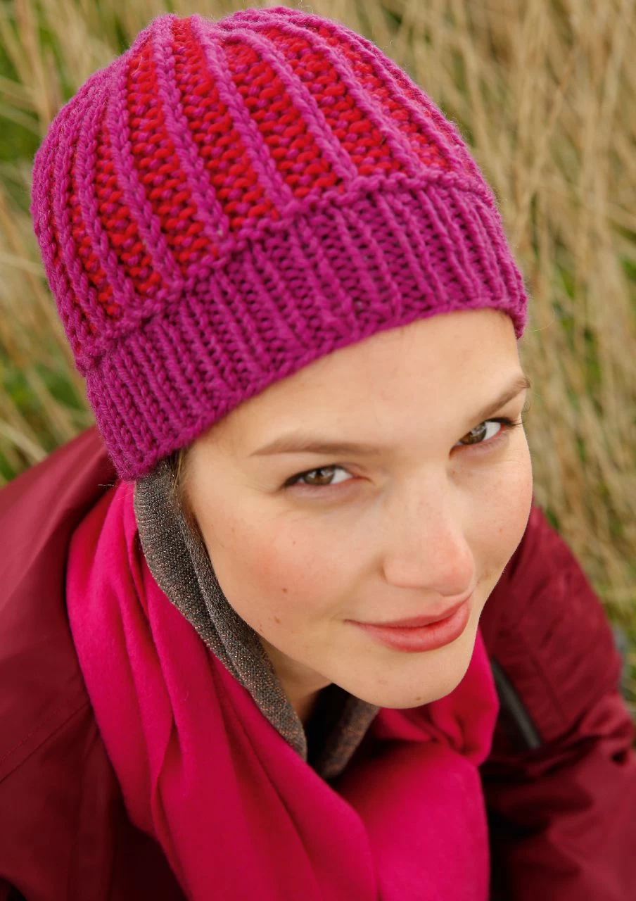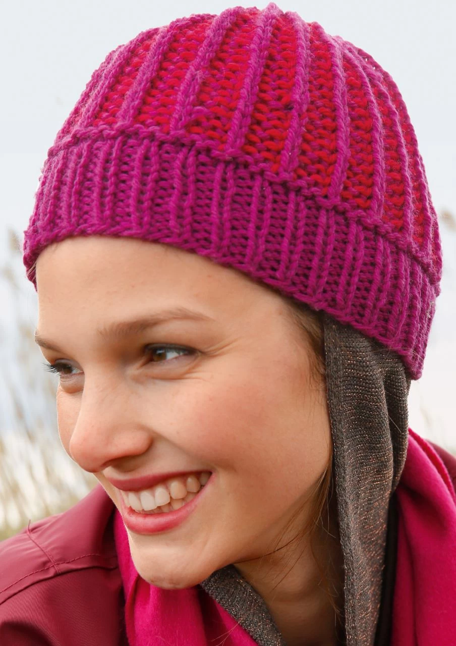 Für das Rippenmuster der zweifarbigen Mütze wird im Wechsel immer eine Runde in der ersten und eine Runde in der zweiten Farbe gestrickt. Mit breitem Bündchen.