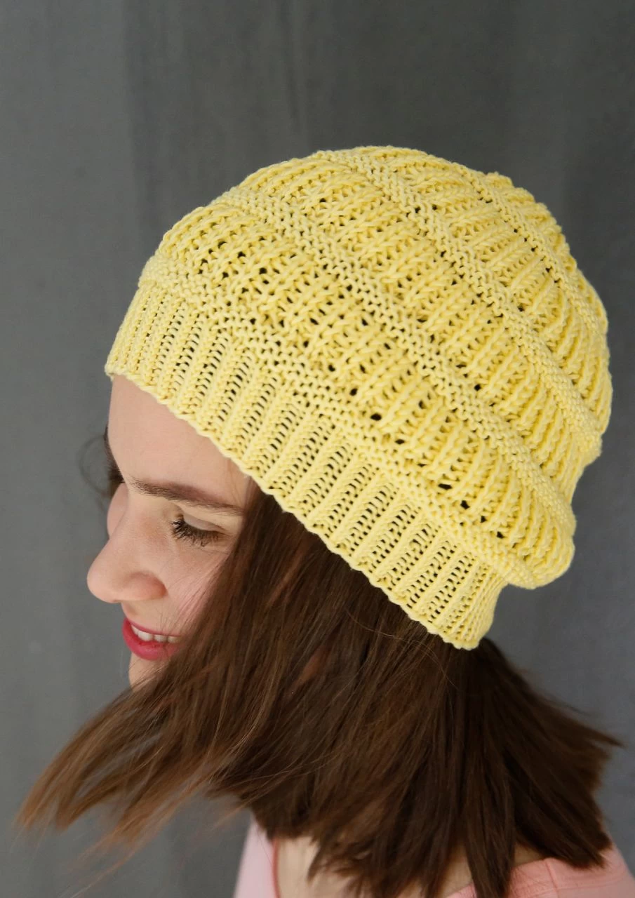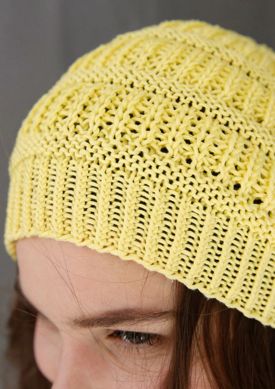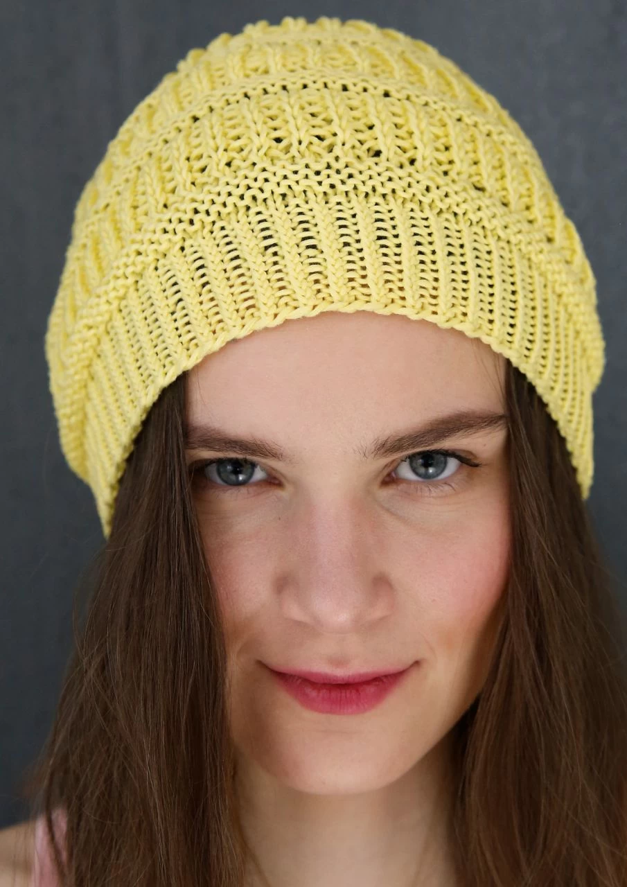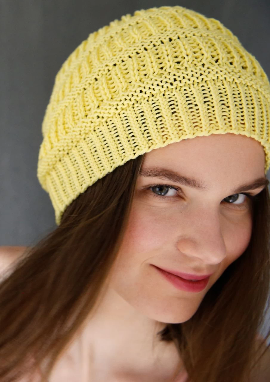 Die Mütze wird gestrickt aus dem ggh-Garn SCARLETT (100% ägyptische Maco-Baumwolle).