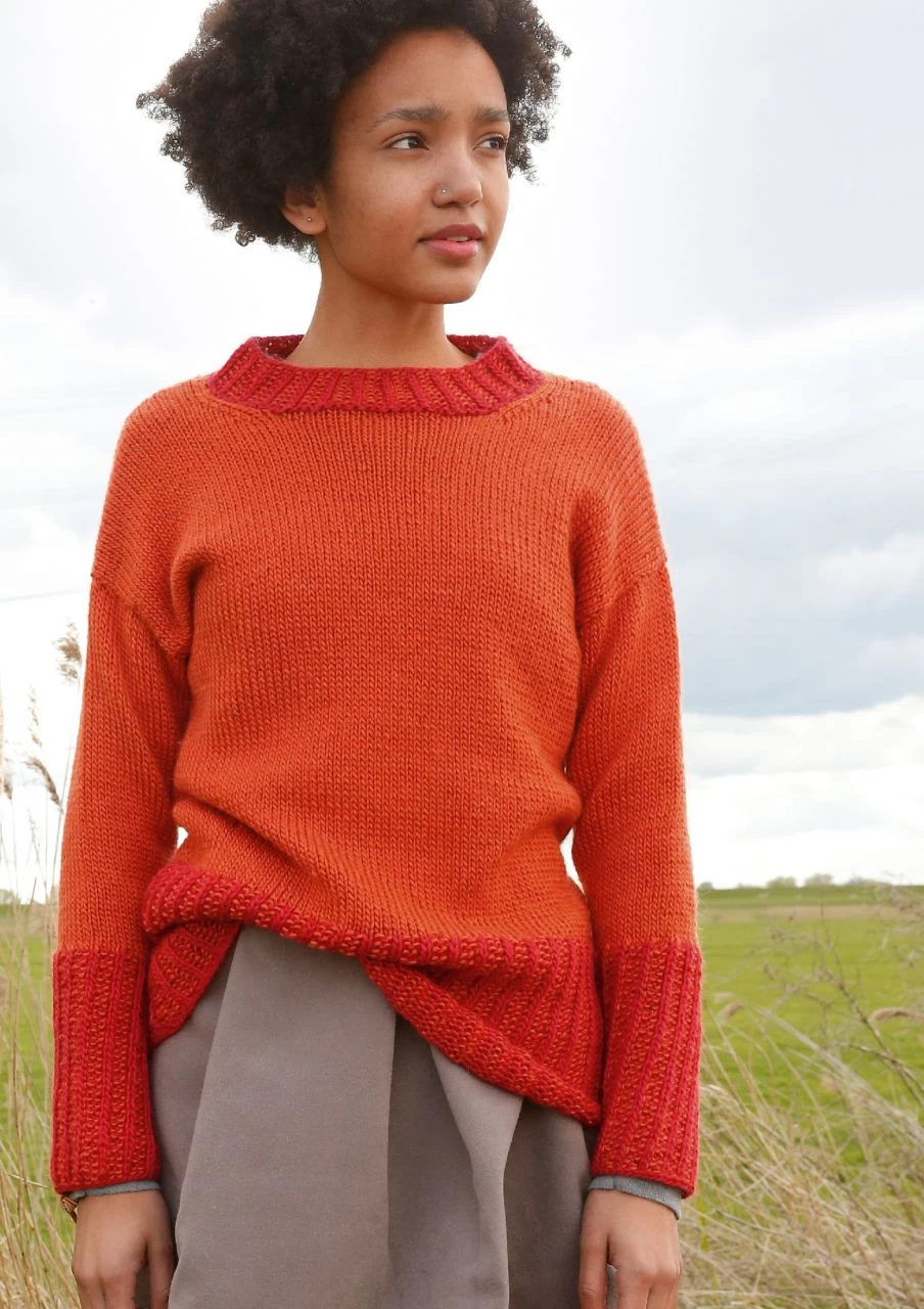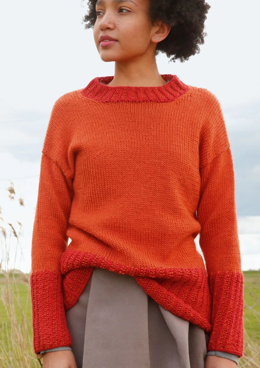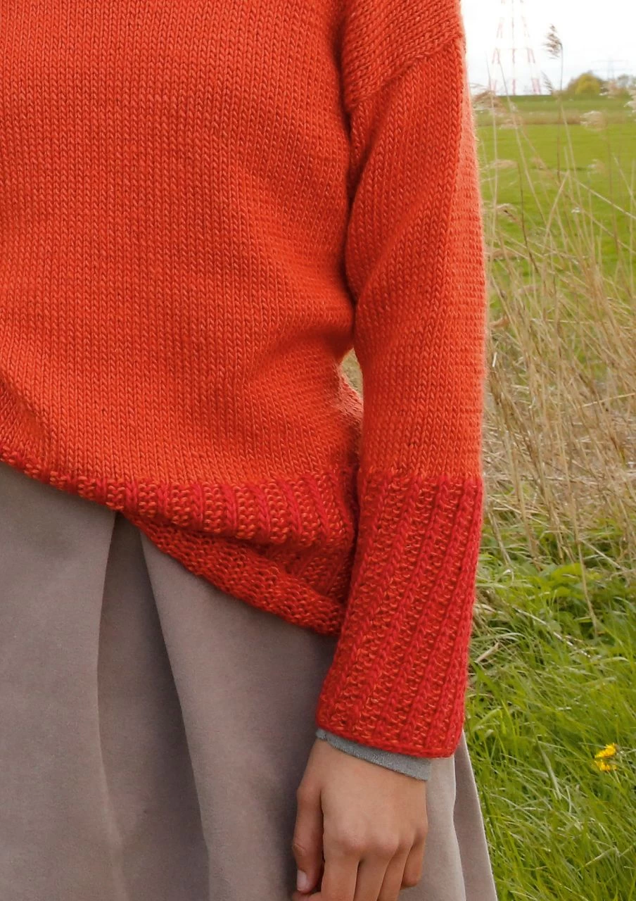 Orange und Rot, Schwarz und Weiß, Grün und Blau – dieser legere Pullover wirkt in jeder gewünschten Farbkombination. Bündchen und Halsausschnittblende sind in zwei Farben gestrickt, einfarbig die glatt rechts gestrickten Teile. Die Ärmel sind von oben nach unten angestrickt, so bleiben die Nähte flacher. Aus edlem Garn mit Mohair, Wolle und Seide.