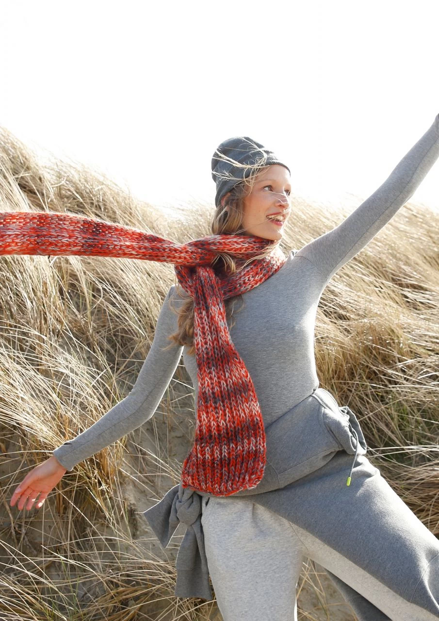 Der dicke Schal wird mit zwei unterschiedlichen Qualitäten dreifädig gestrickt. Mit Nadeln 8–9 ist er in wenigen Stunden fertig.