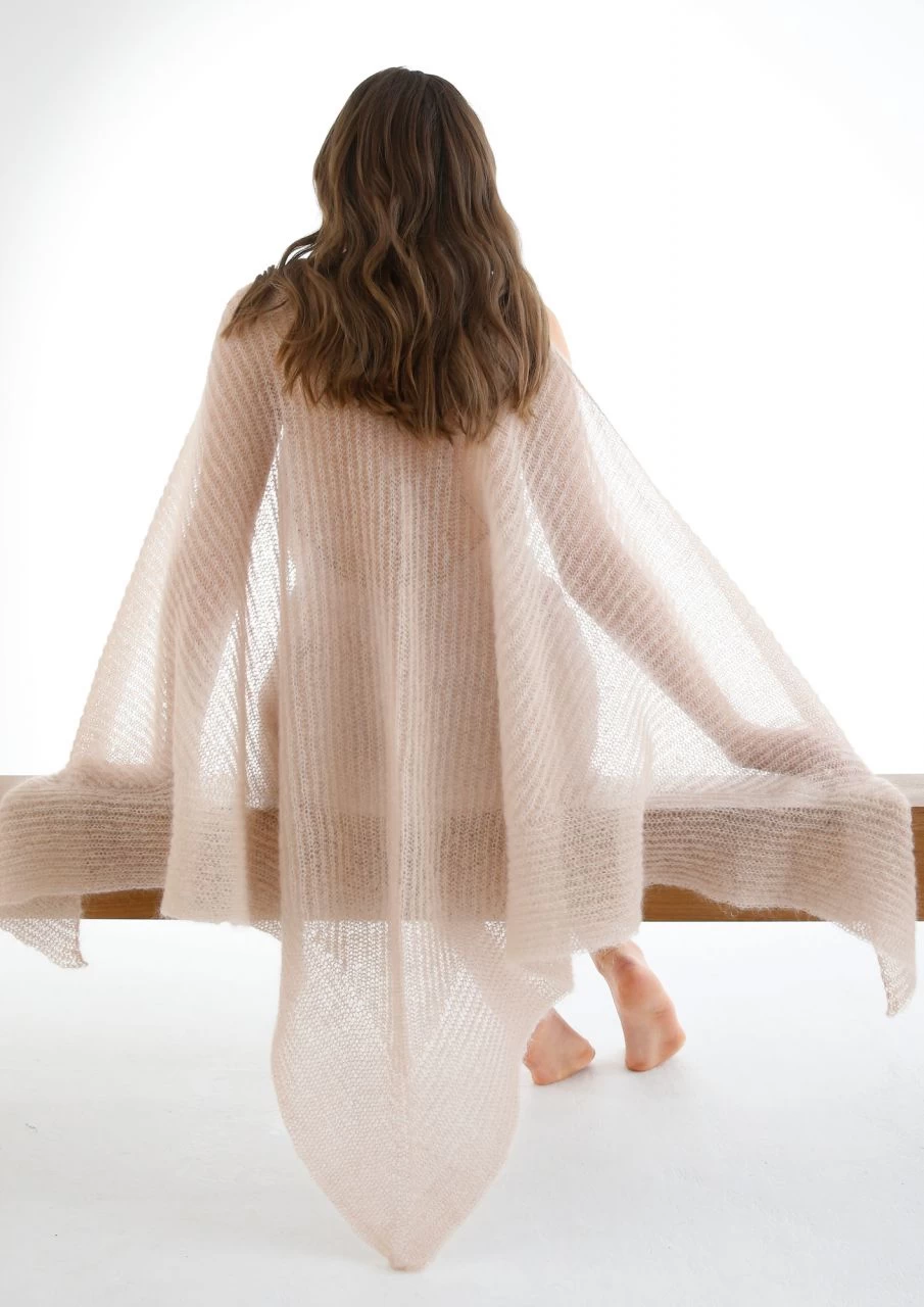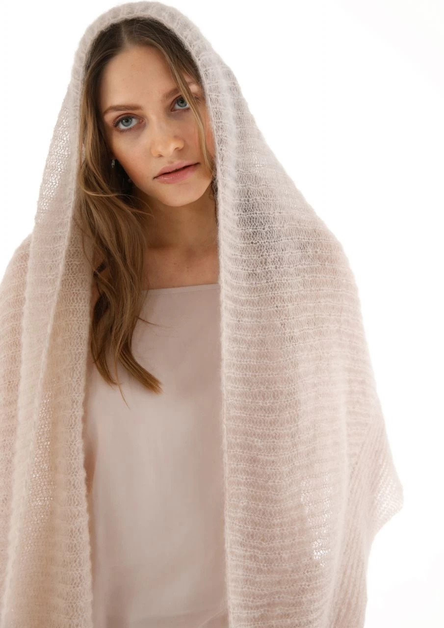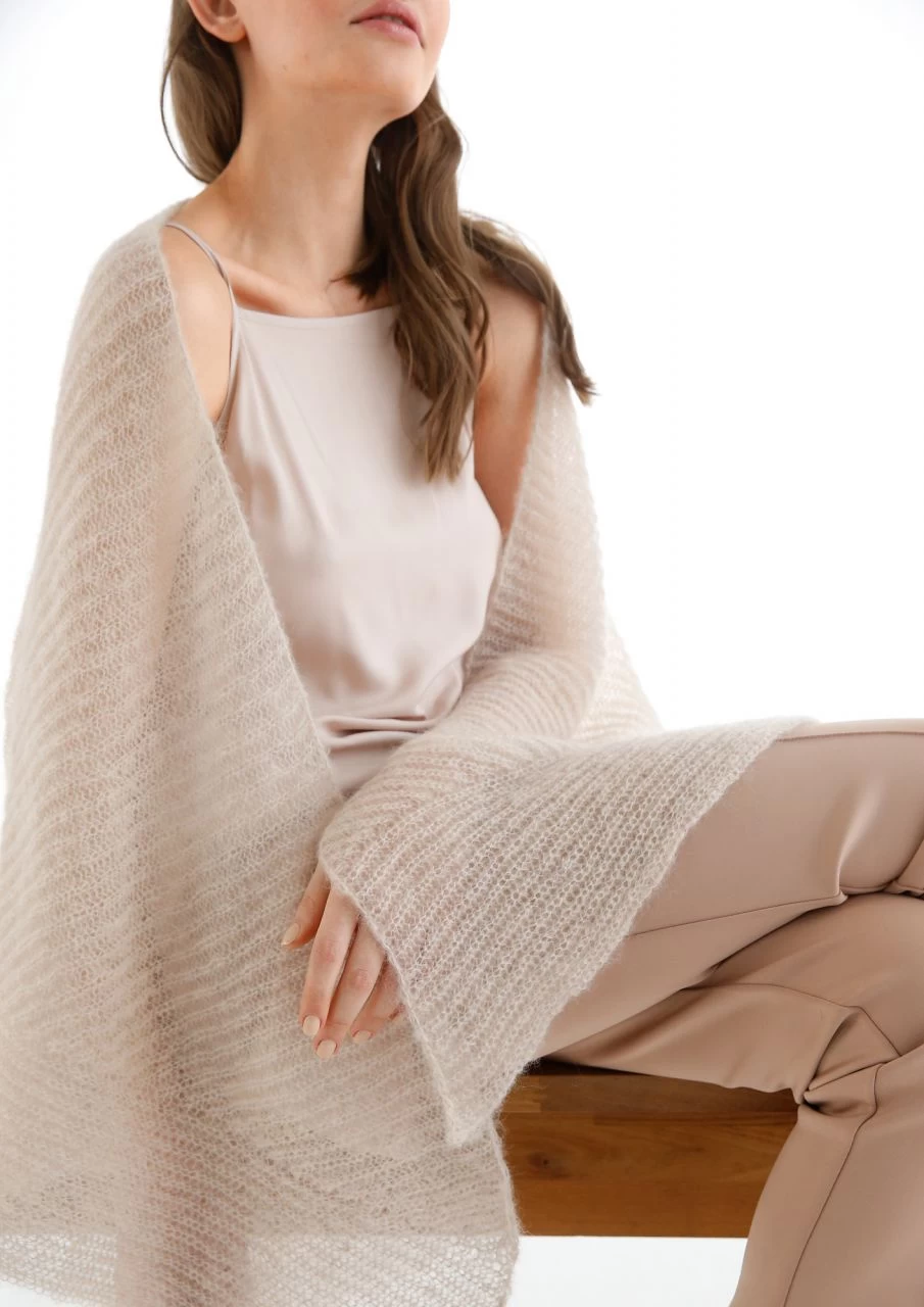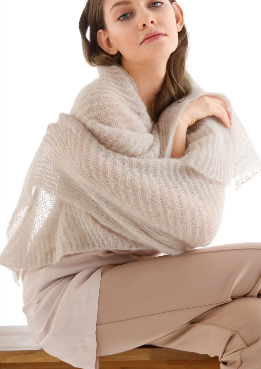 Das Tuch wird gestrickt aus dem ggh-Garn KID (65% Super-Kid-Mohair, 5% Schurwolle, 30% Polyamid).