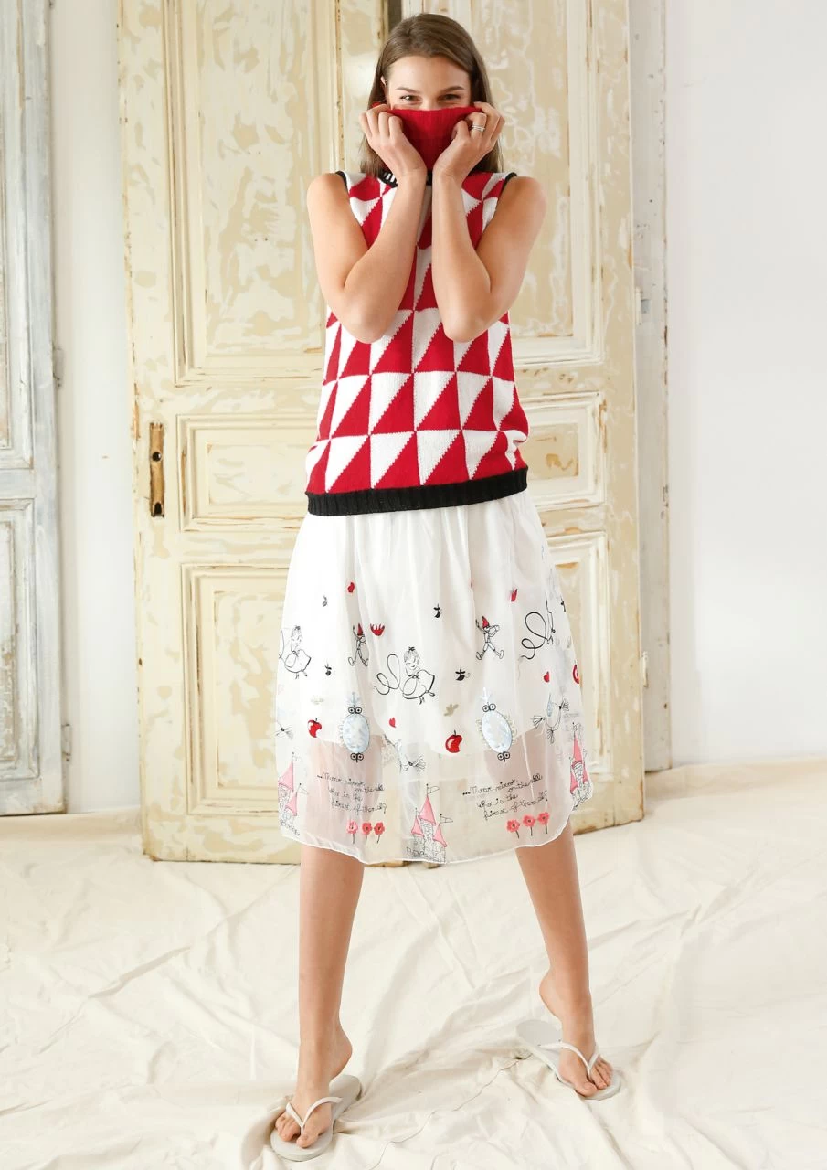 Knackig in Rot und Weiß gestrickt ist der Pulli mit Dreiecken. Das sieht super aus auch mit Schwarz, Gelb, Grün, Blau oder einer anderen Farbkombination. Aus pflegeleichtem Schurwollgarn.
