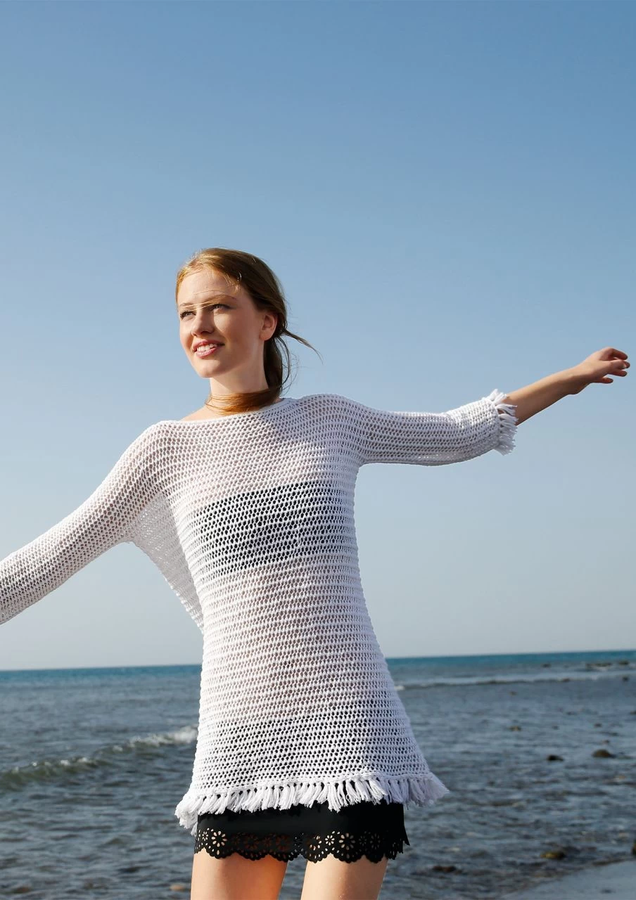 Der weiße Pulli mit Netzmuster ist in einem Stück quer gestrickt. Die Fransen werden nachträglich an alle Kanten geknüpft. Das Baumwollgarn dafür gibt es in 13 topaktuellen Farben.