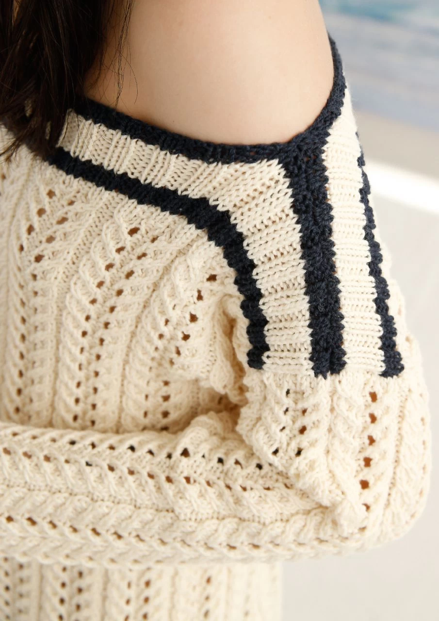 Senkrechte Lochmuster-Rippen mit verkreuzten Maschen zieren den wollweißen Pullover. Beim U-Boot-Ausschnitt kannst du die Breite des Halsausschnitts beliebig verändern. Aus Merino mit Baumwolle.