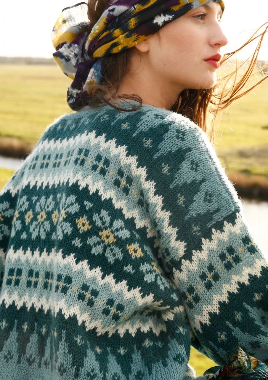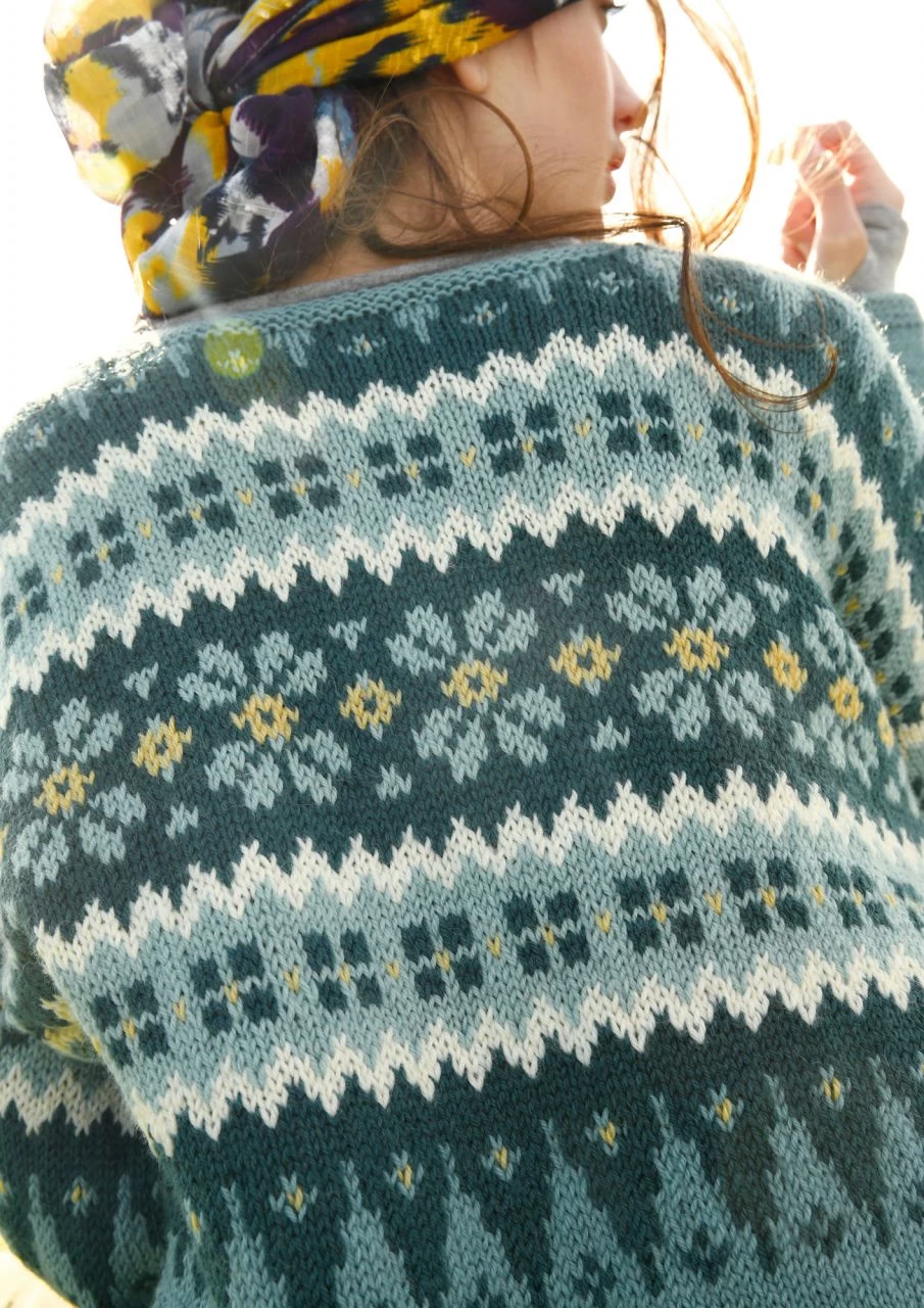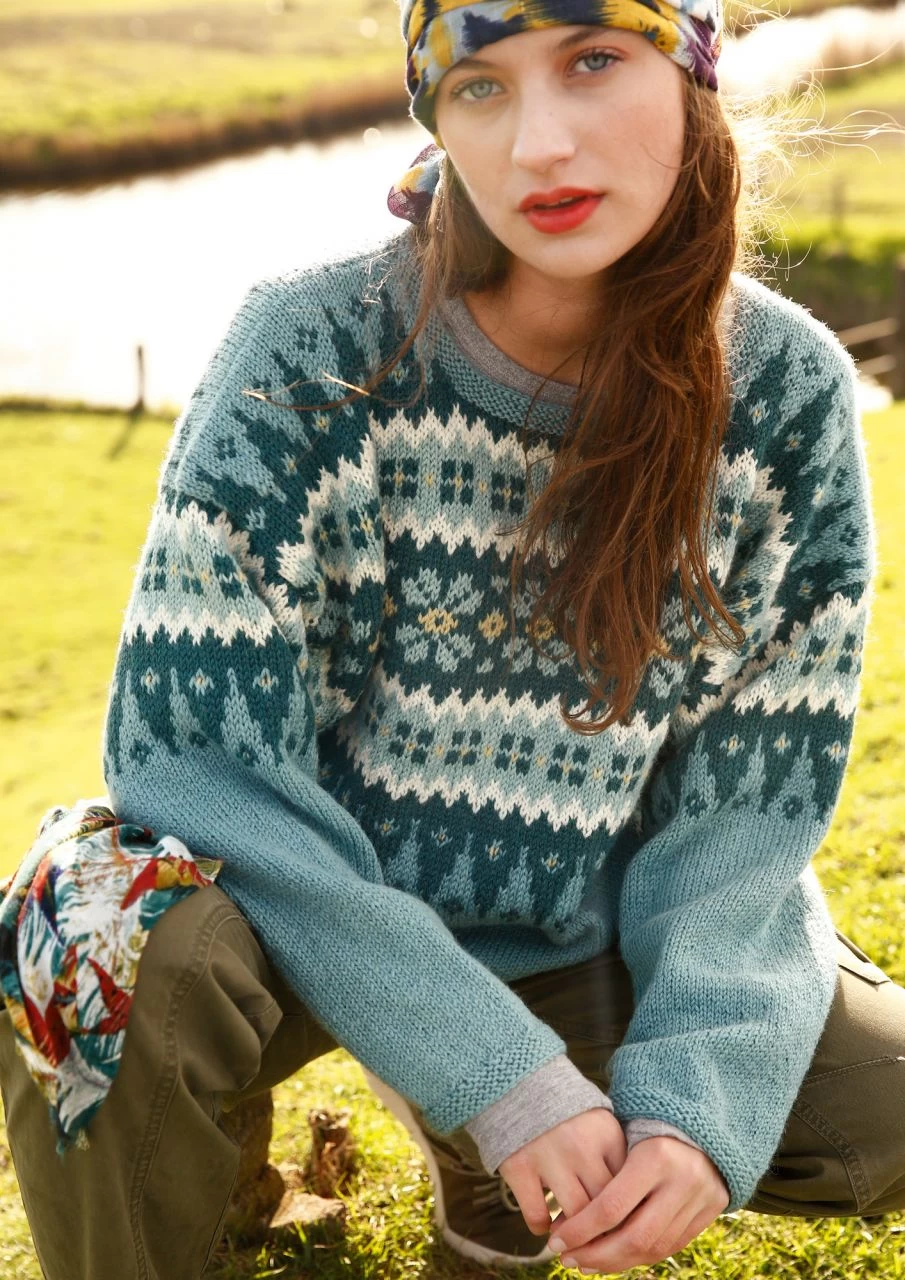 In topaktuellen und sehr harmonischen Farben gestrickt ist der Pullover mit breiter Jacquardpasse. Er ist gerade geschnitten und hat einen runden Halsausschnitt. Die Ärmel sind von oben nach unten angestrickt; hier wird nur im oberen Bereich ein Teil des Jacquardmusters gestrickt, dann geht’s einfarbig weiter.