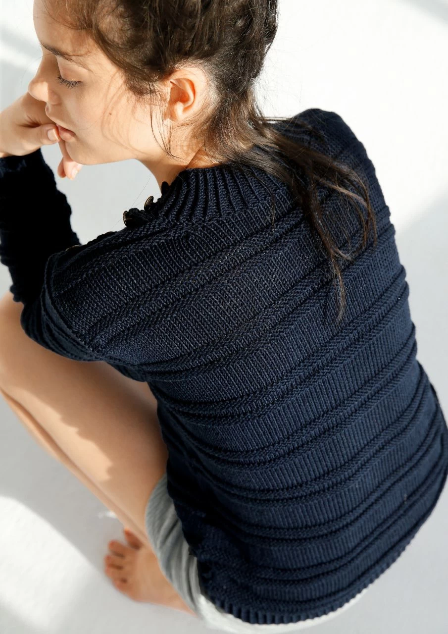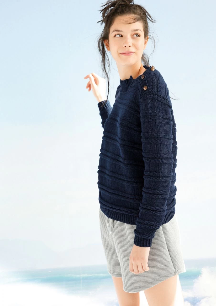 Sportlich, lässig, schick in Marine. Damit die Querrippen auch nach dem Zusammennähen aneinander treffen, sind alle Reihenzahlen angegeben. Einen bequemen Einstieg hat man durch die Knopfleiste auf der linken Schulter. Aus Merino mit Baumwolle.