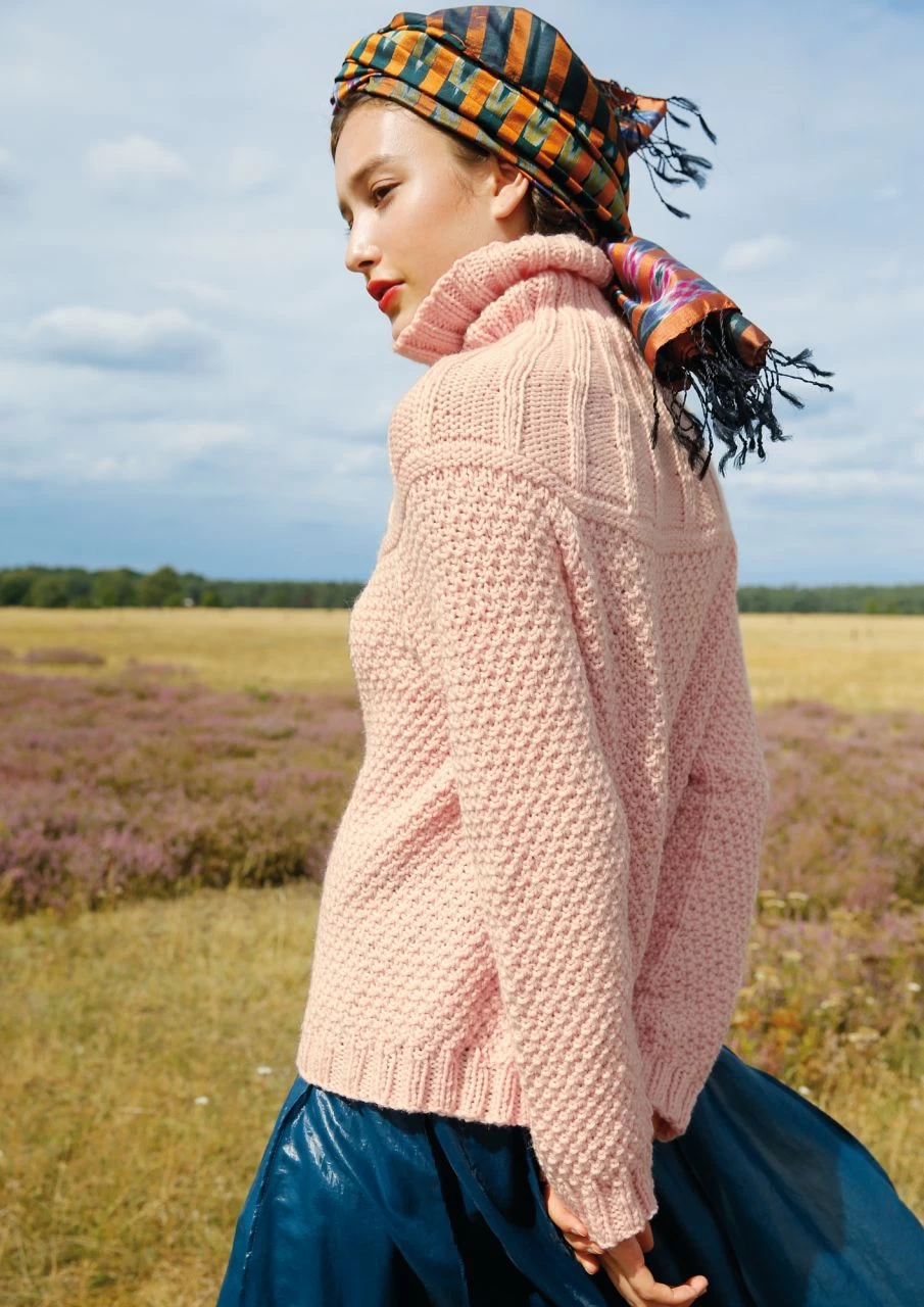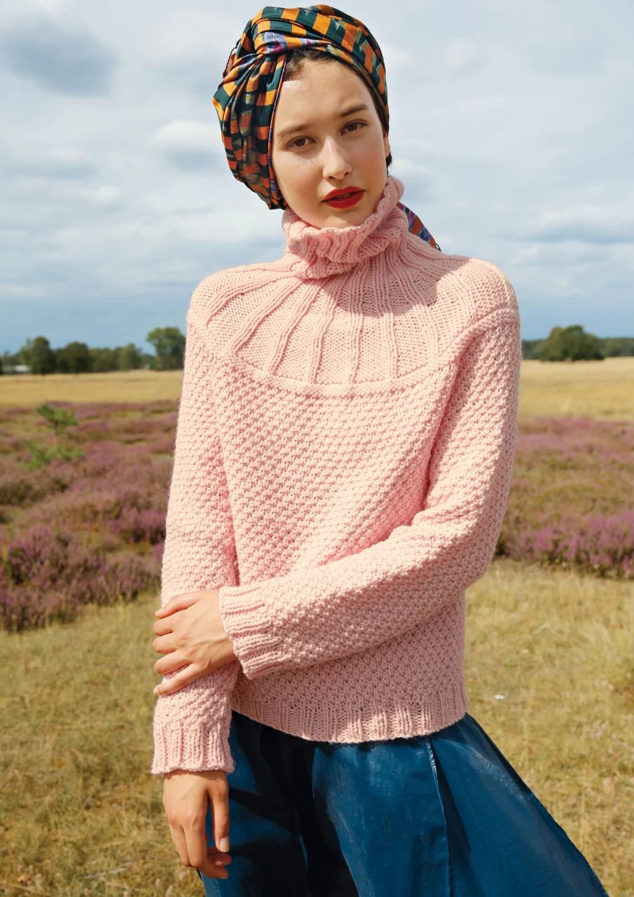 Du fängst am Rollkragen im Rippenmuster an, versteckst die Zunahmen für die Passe in den linken Rippen, teilst dann die Maschen für die Raglanschrägen neu ein und strickst Korpus und Ärmel nahtlos im großen Perlmuster. So entsteht ein Rundpassenpulli mit ausgewogenen Musterpartien, die den Schnitt perfekt betonen. Wir haben uns aus der großen Farbkarte der reinen Superwash-Schurwolle ggh SPORTLIFE ein zartes Rosé ausgesucht – auch deine Wahl?