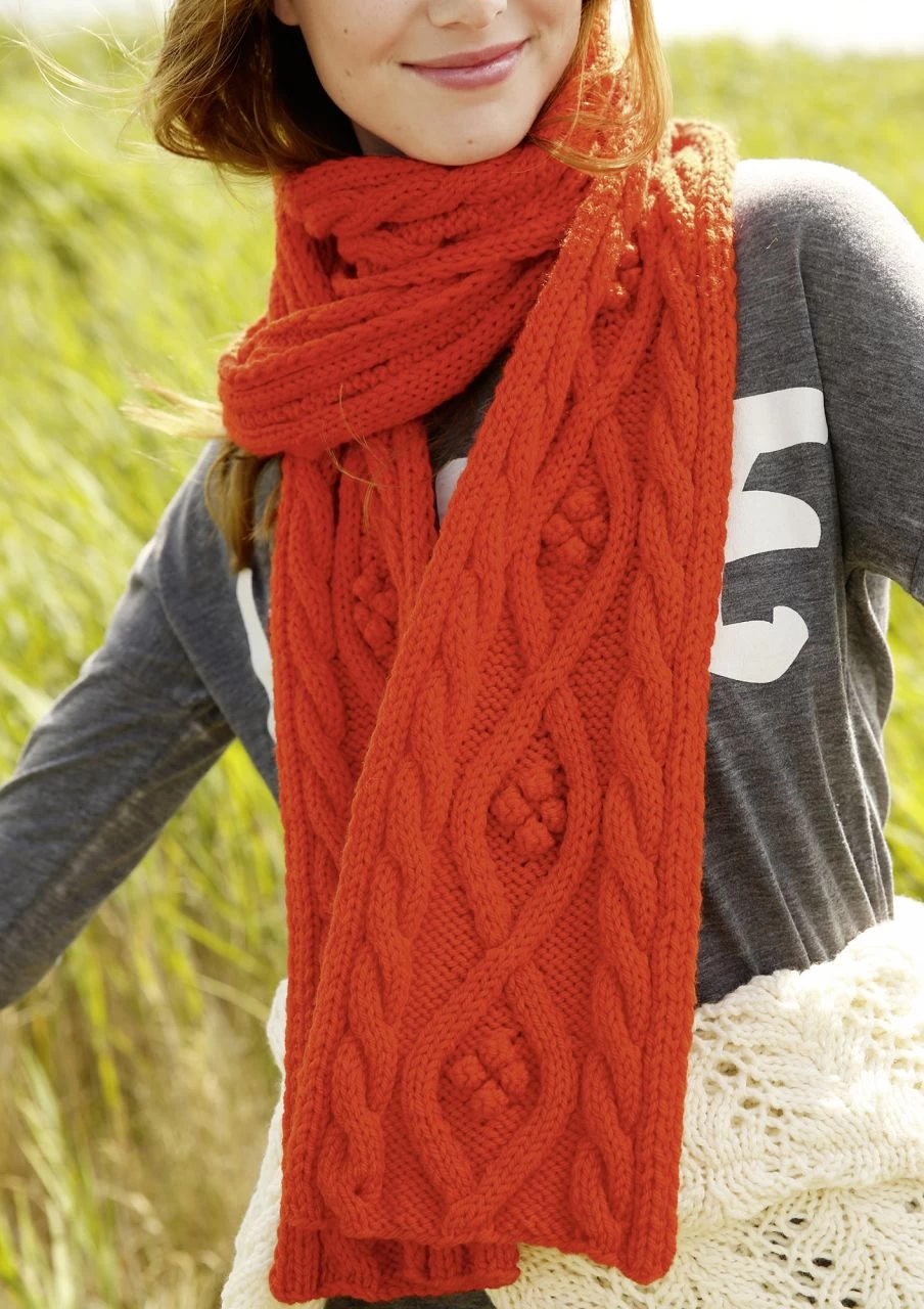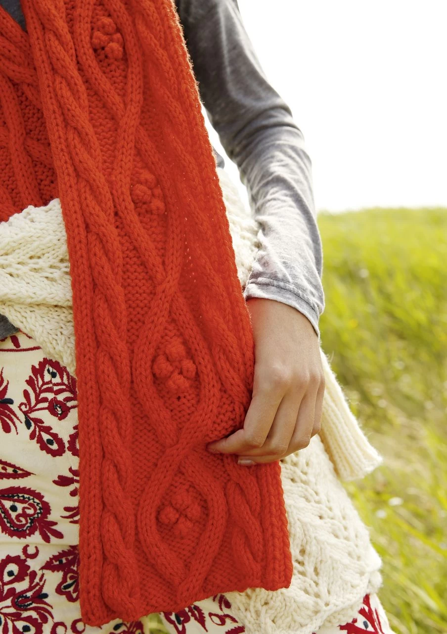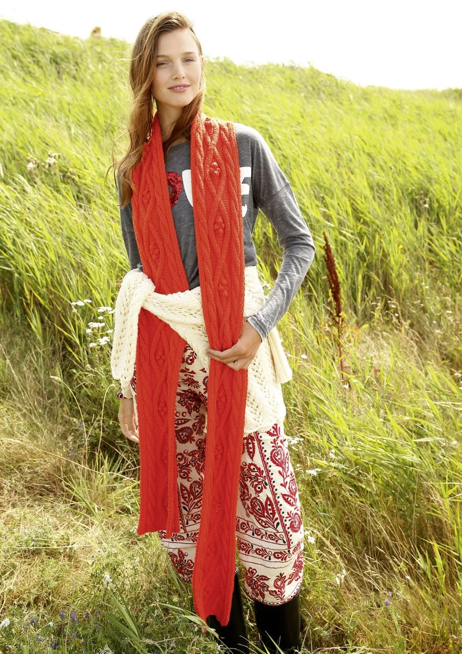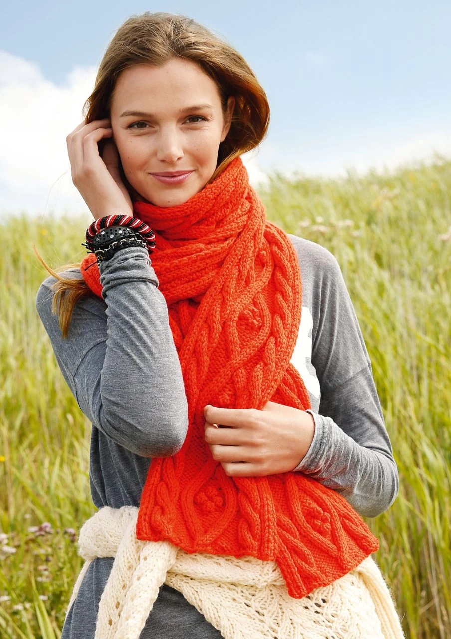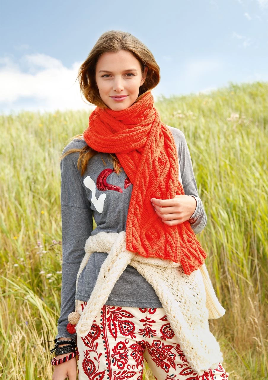 Superlang ist der Schal in frischem Orange. Das Rhombenmuster mit Noppen ist an beiden Seiten von schmalen Zöpfen eingerahmt. Von der pflegeleichten reinen Schurwolle gibt es in fast 40 Farbtönen. Da bleibt kein Farbwunsch offen.