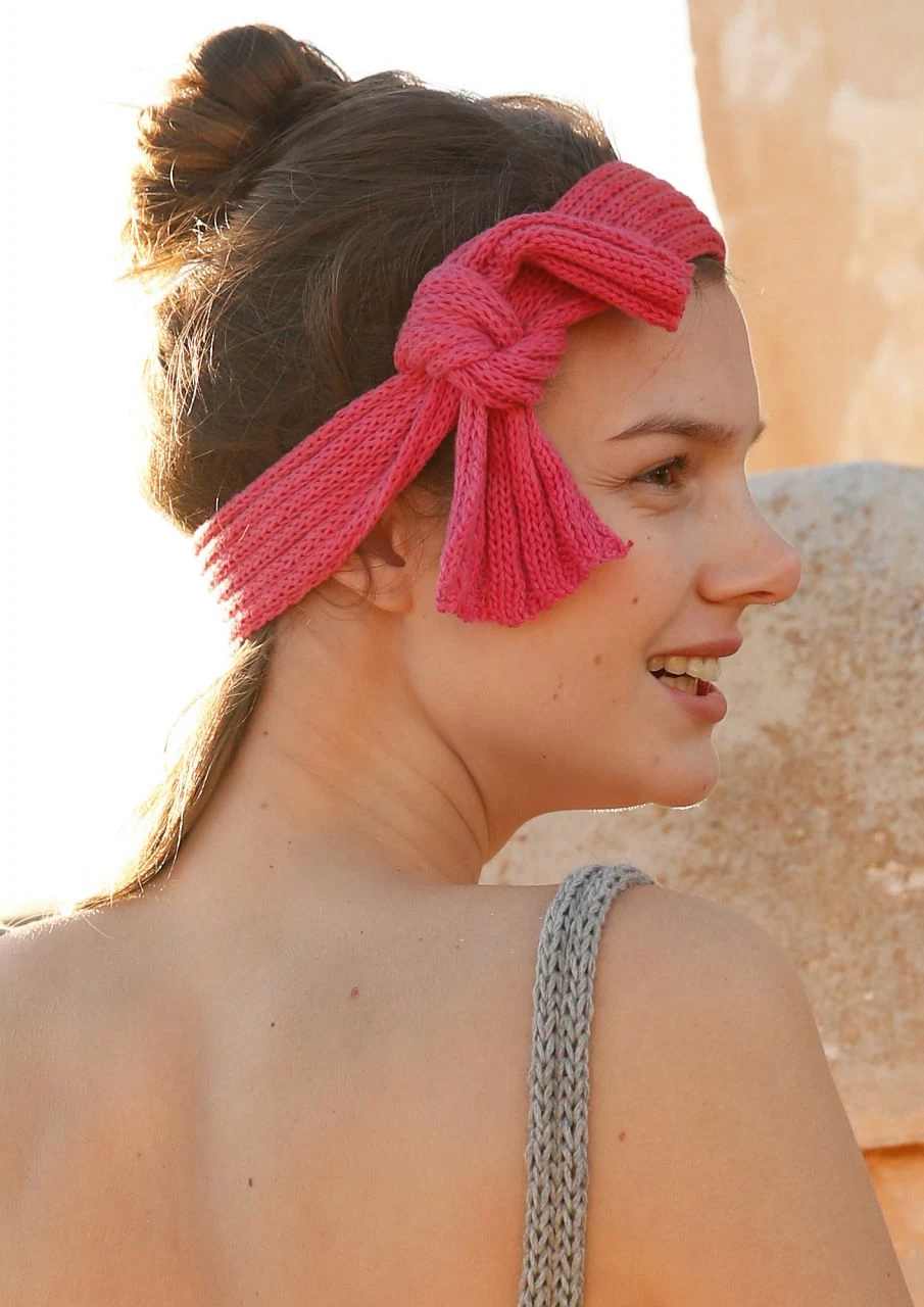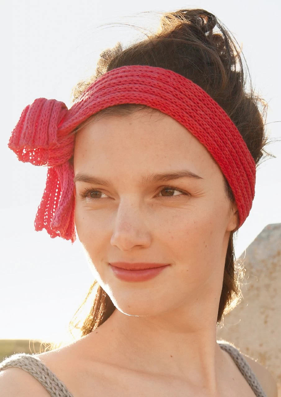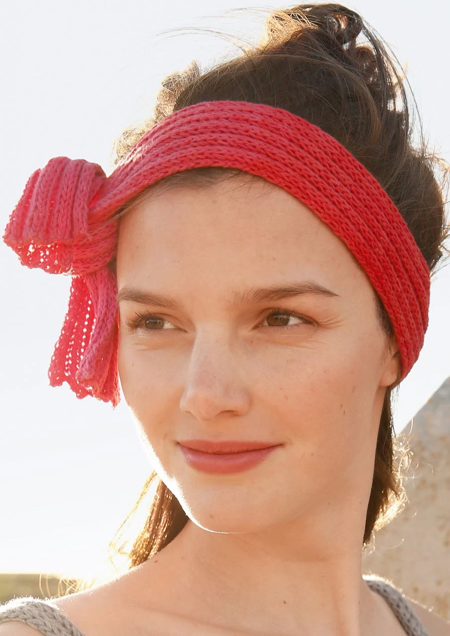 Das lange Stirnband ist im Rippenmuster gestrickt. Die Enden werden verknotet. Sehr harmonisch ist der Farbverlauf der reinen Baumwolle, hier Pink und Koralle. Erhältlich sind neun weitere tolle Farbkombinationen.
