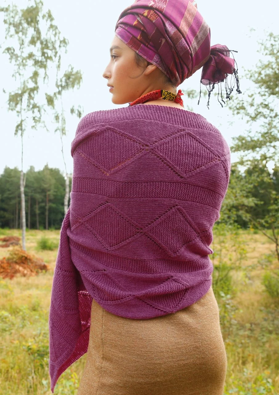 Lochmusterrhomben mit krausen Innenflächen geben dem schönen, großen Schultertuch ein attraktives Maschenbild und machen das Stricken abwechslungsreich, aber nicht allzu schwierig. Die herrlich softe Merinoseide ggh LACY sorgt für edlen Kuschelkomfort. Ein Hingucker in Zyklam – oder stehst du eher auf Senfgelb, Dunkelblau oder Flieder?