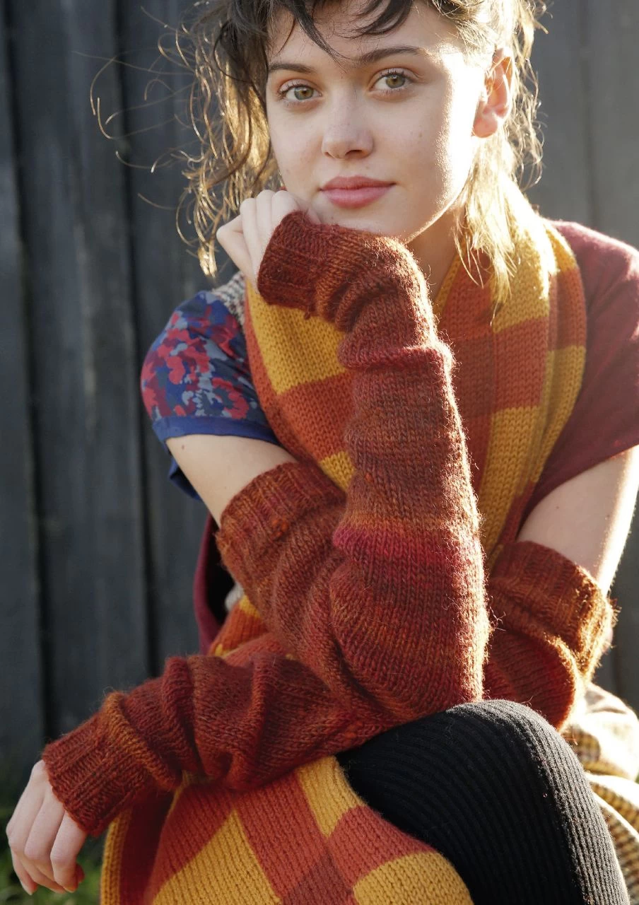 Die superlangen Armstulpen sind in Runden glatt rechts gestrickt.