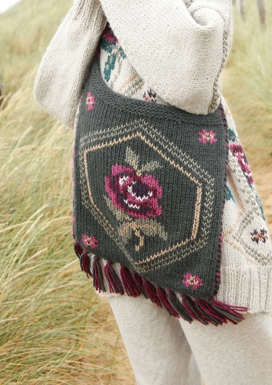 Accessoires machen den Look perfekt! Mit den Resten vom Besticken des Rosenpullis Modell 32 aus Rebecca Nr. 80 kannst du eine schöne, praktische Beuteltasche besticken. Sieht toll aus – mit oder ohne Rosenpulli.