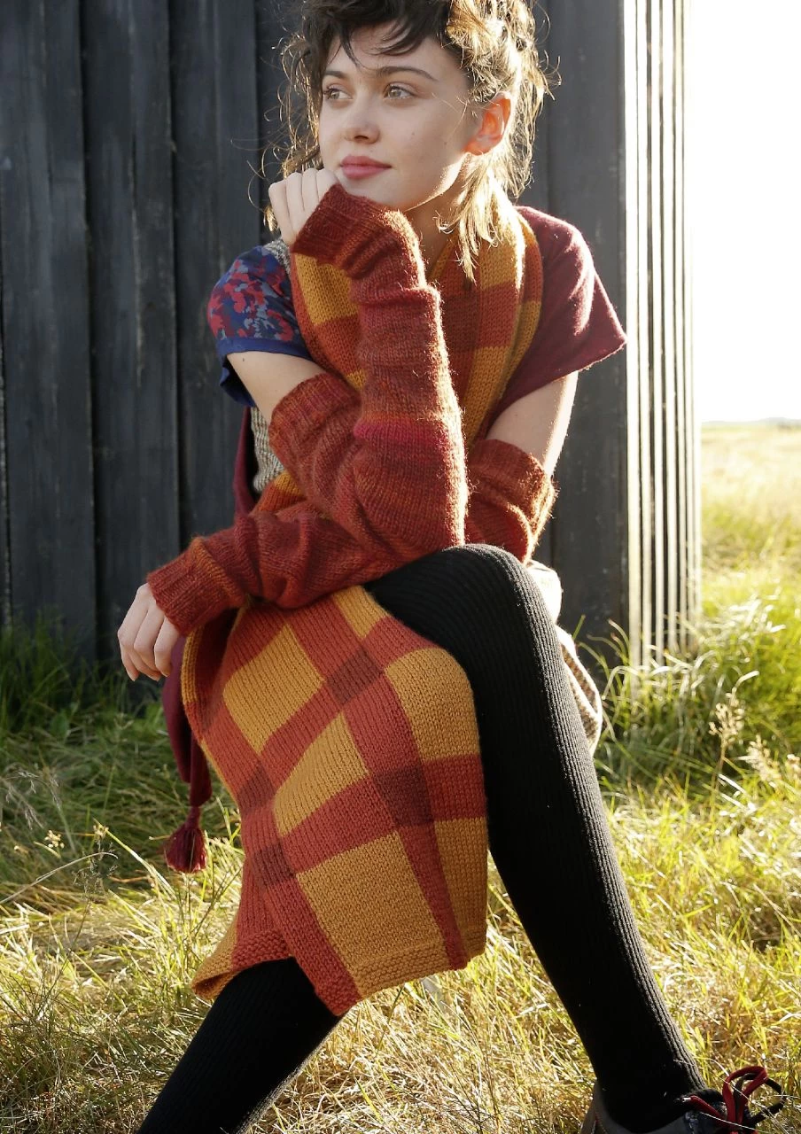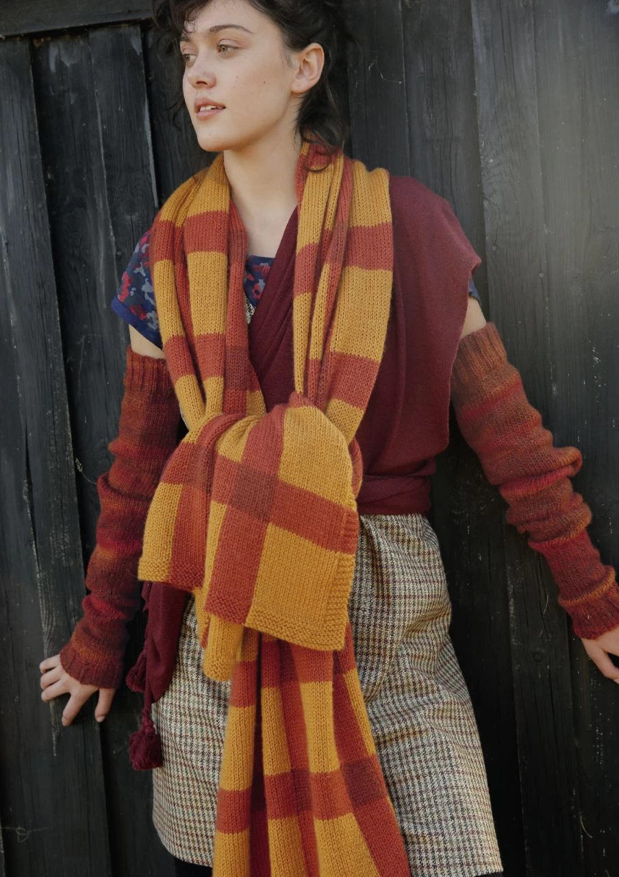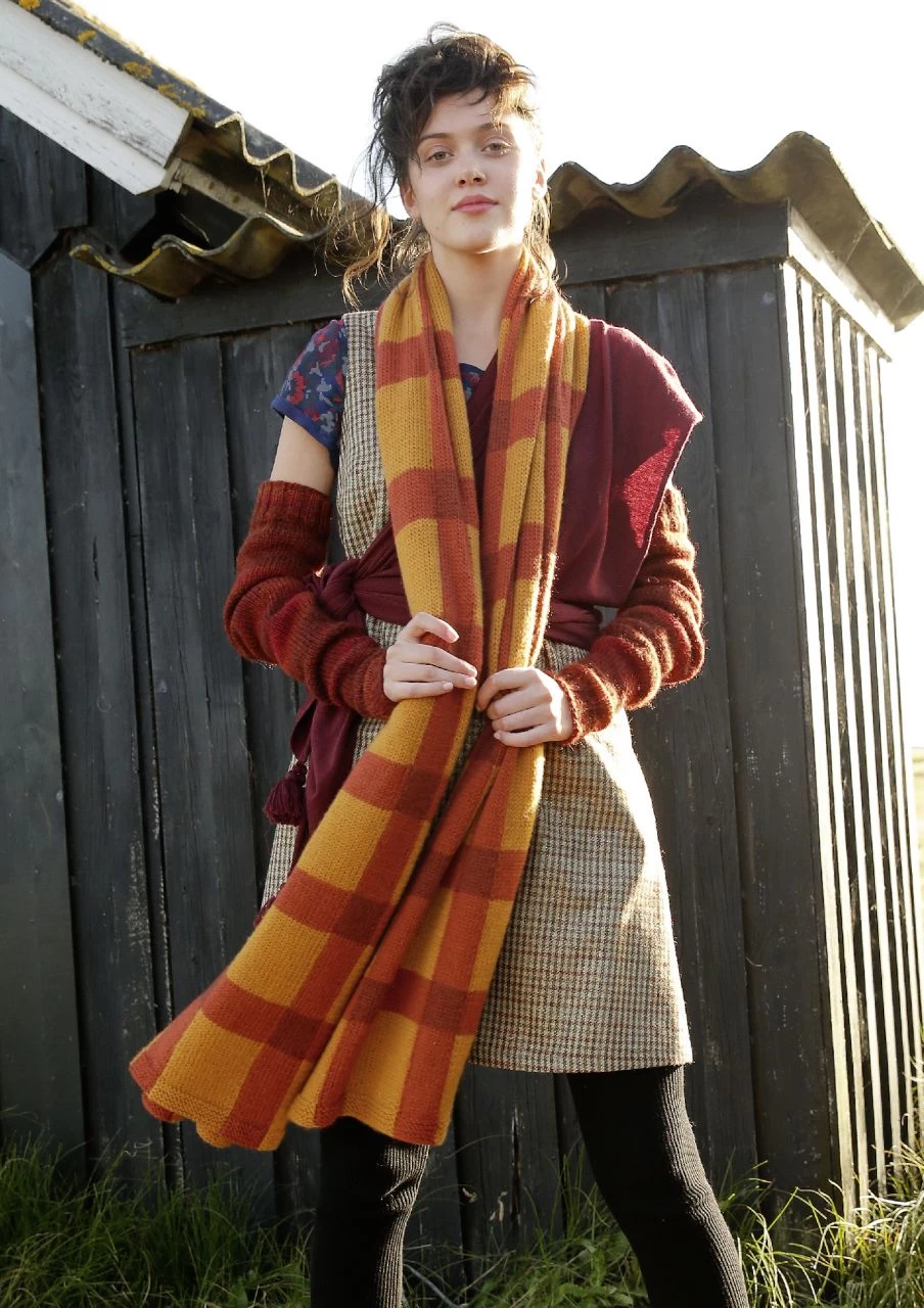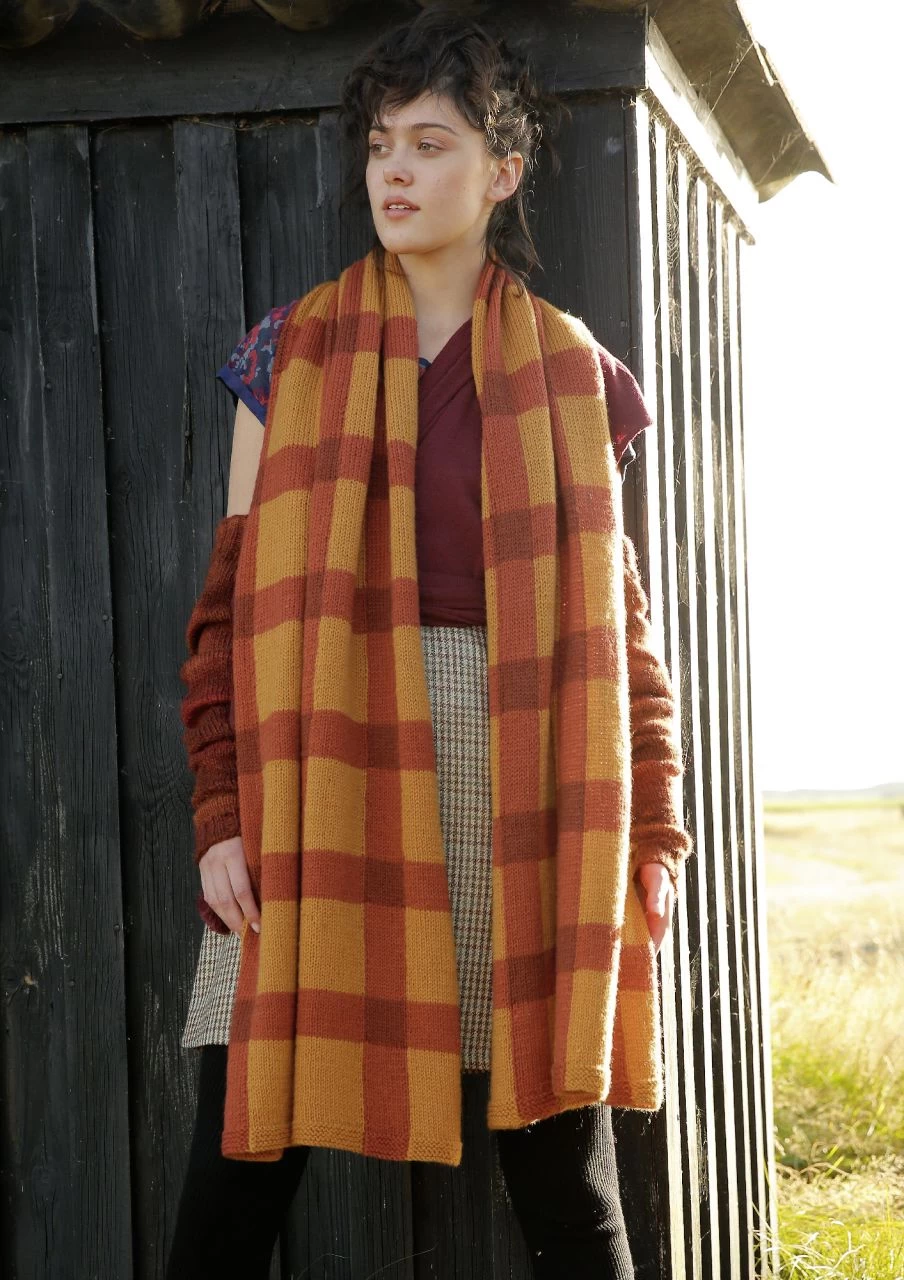 Das große Schultertuch ist im Karomuster glatt rechts in Intarsientechnik gestrickt. Damit sich die Ränder nicht rollen, sind rundum kraus rechte Blenden gearbeitet.