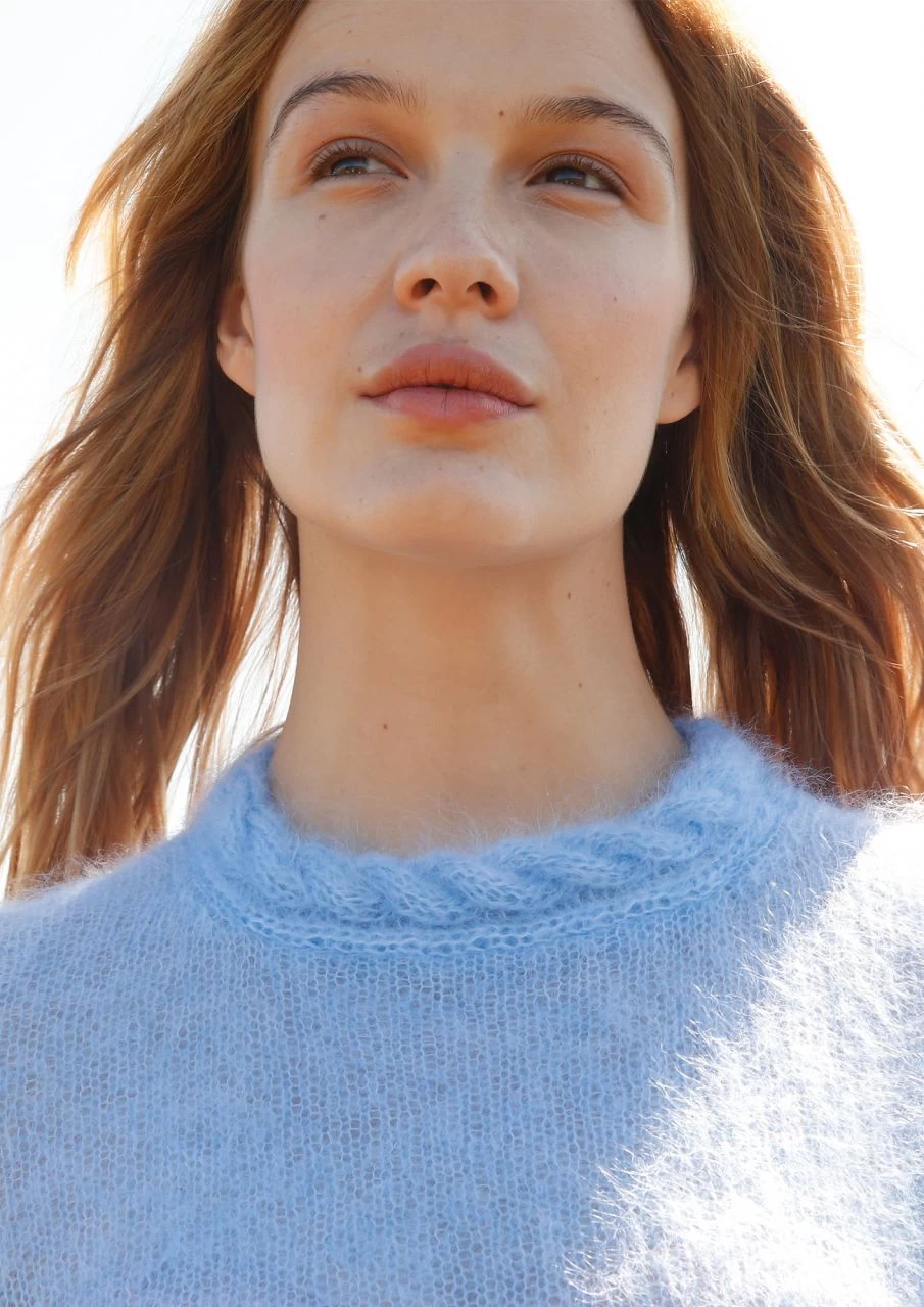Federleichte 100 -150 g des neuen feinen Garns MOHAIR MELANGE aus extrem zarten Kid-Mohair werden für diesen luftigen Kuschelpulli verstrickt. Charmantes Detail: die separat gearbeitete Zopfblende, die den Halsausschnitt schmückt.